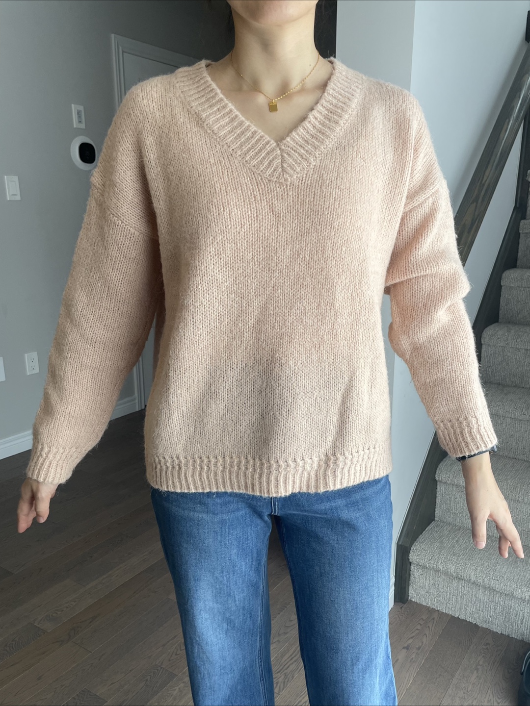 Here's a cozy peach-coloured knit sweater with a V-neck. It's in great condition and ready to keep you warm!