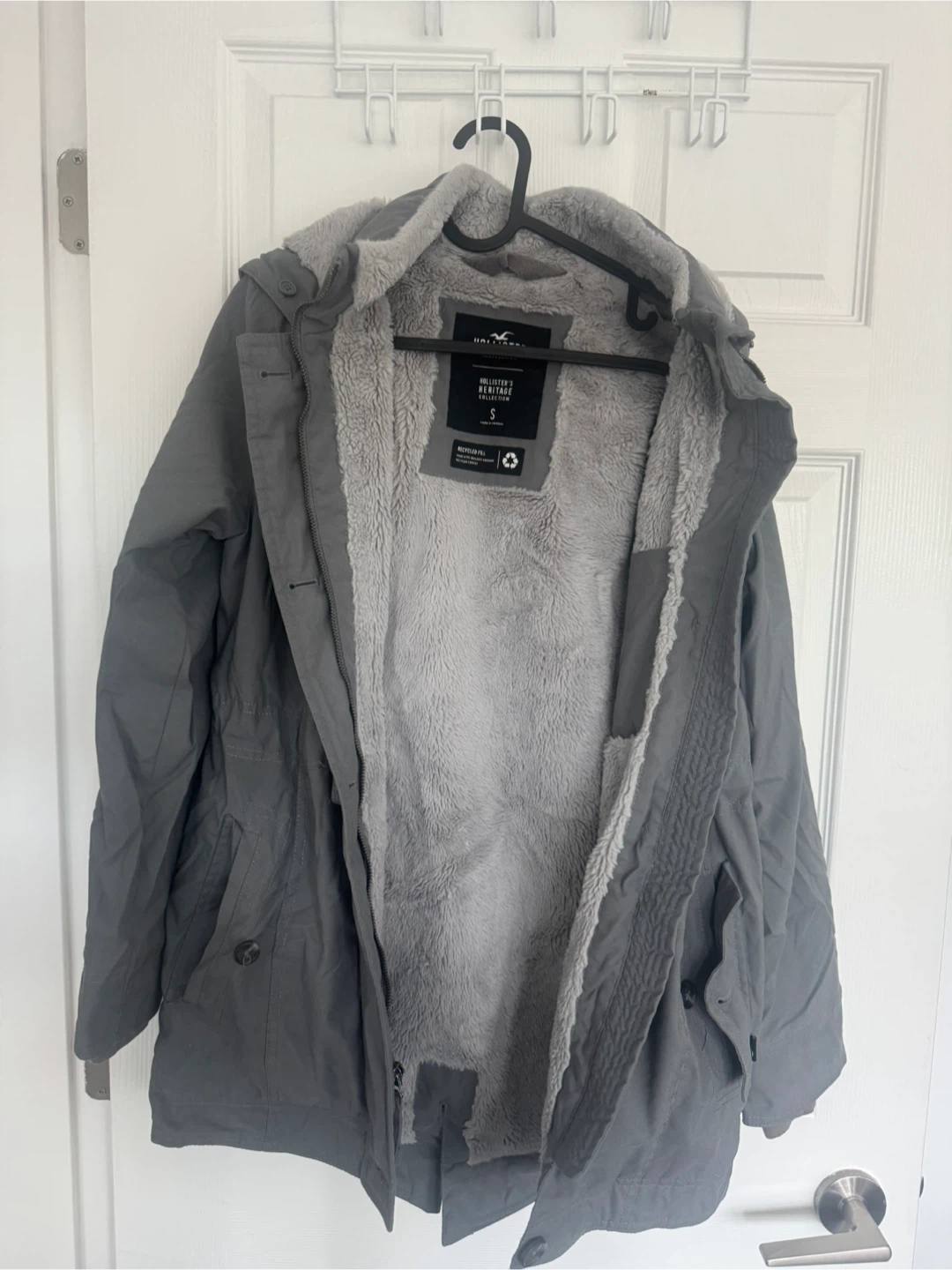 Cozy Hollister parka with a sherpa lining, perfect for chilly days! It's a size small and in great condition. The colour is a versatile grey that goes with everything. Stay warm and stylish!