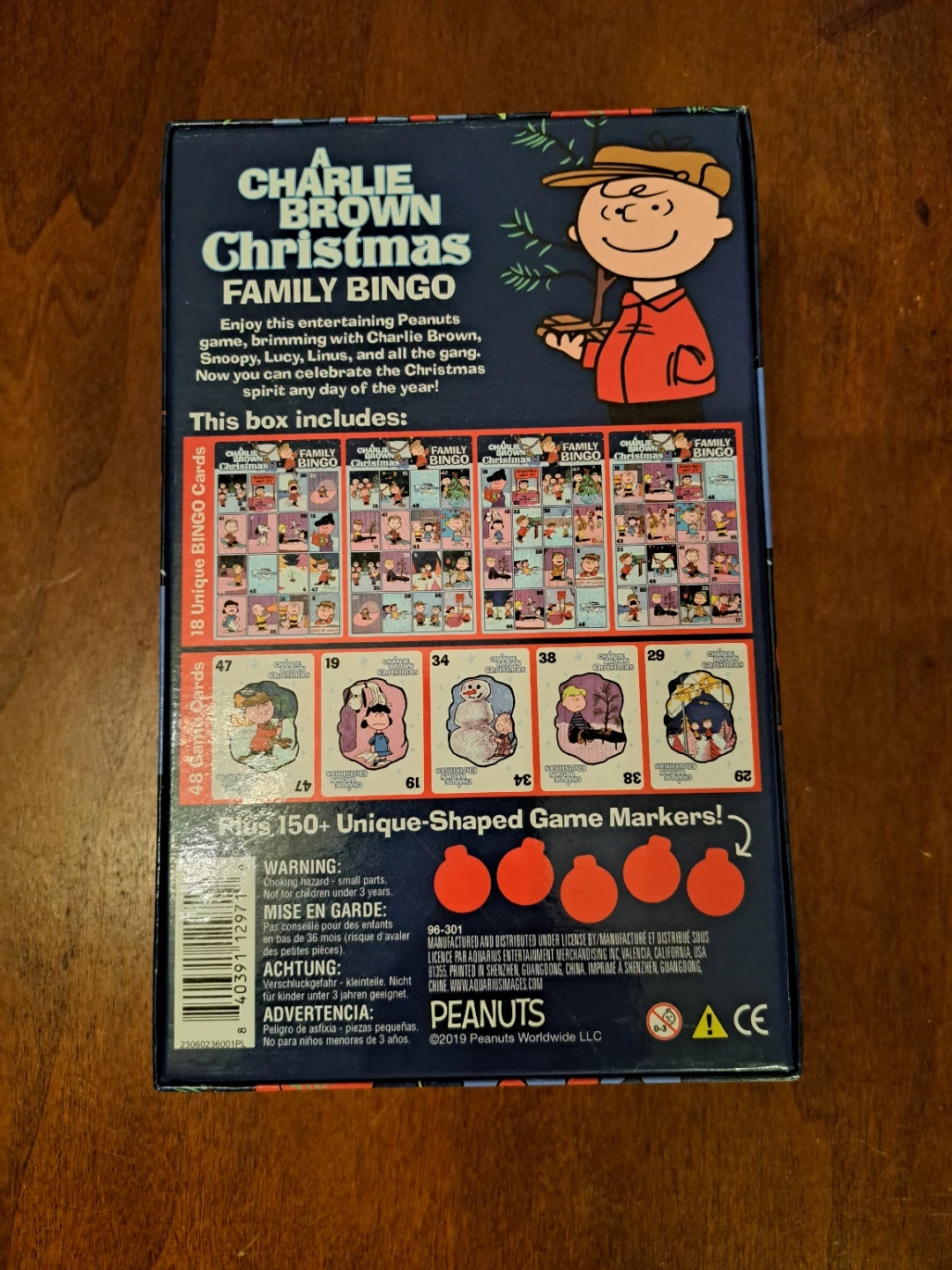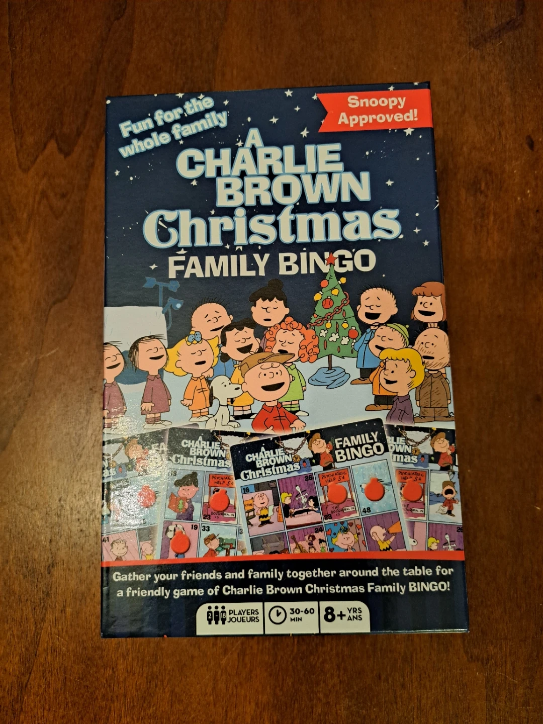 Enjoy this entertaining Peanuts game featuring Charlie Brown, Snoopy, Lucy, Linus, and all the gang! This box includes 18 unique Bingo cards plus 150+ unique-shaped game markers! It's fun for the whole family, and Snoopy approved! Gather your friends and family together around the table for a friendly game of Charlie Brown Christmas Family Bingo! Recommended for ages 8+.