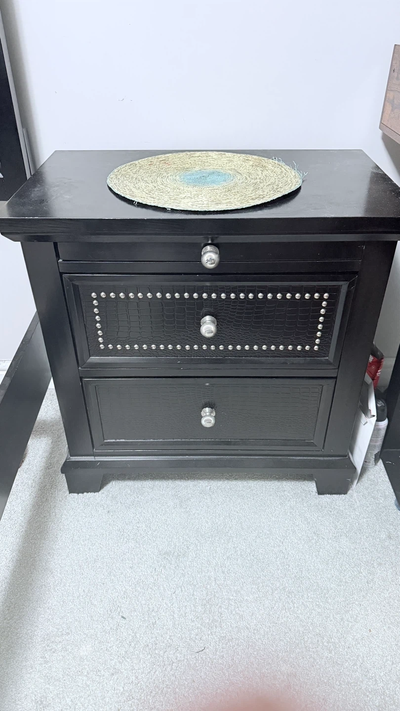 Selling a Queen bedroom set that includes a bed frame, dresser, and two nightstands. The furniture is black with silver accents and a white headboard. Perfect for a bedroom makeover!