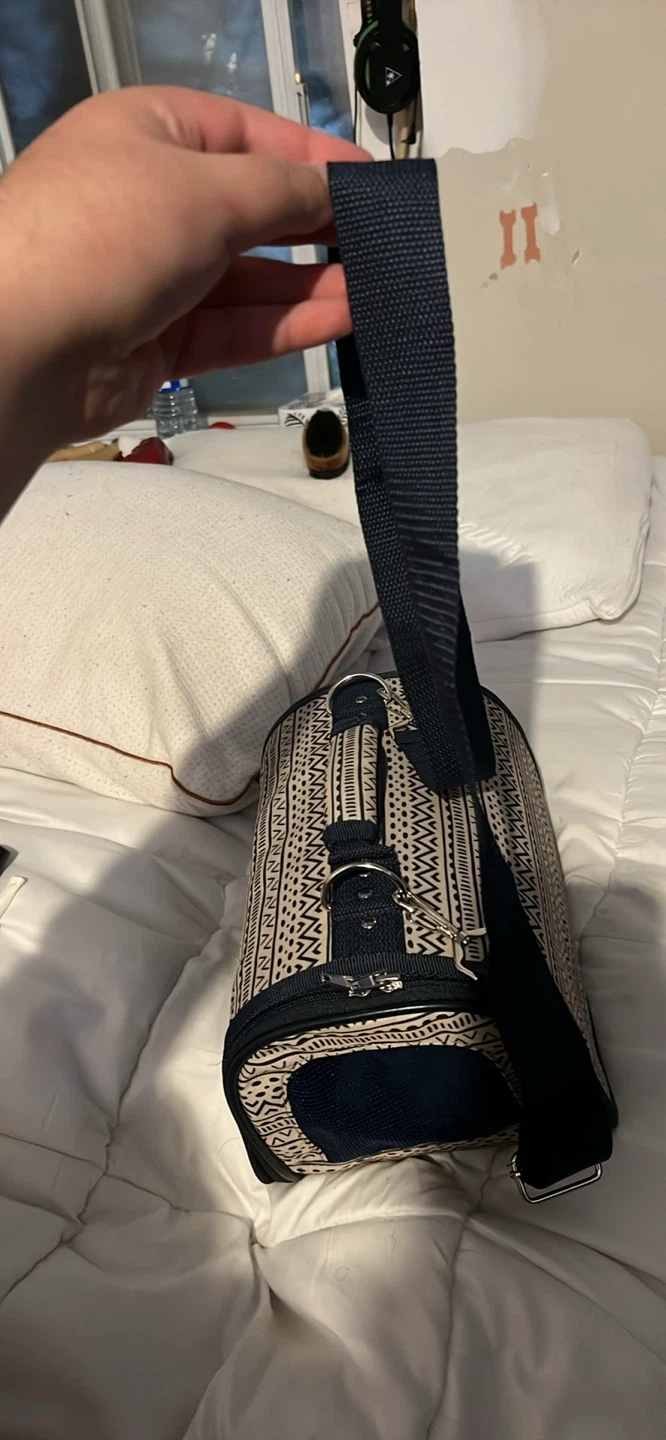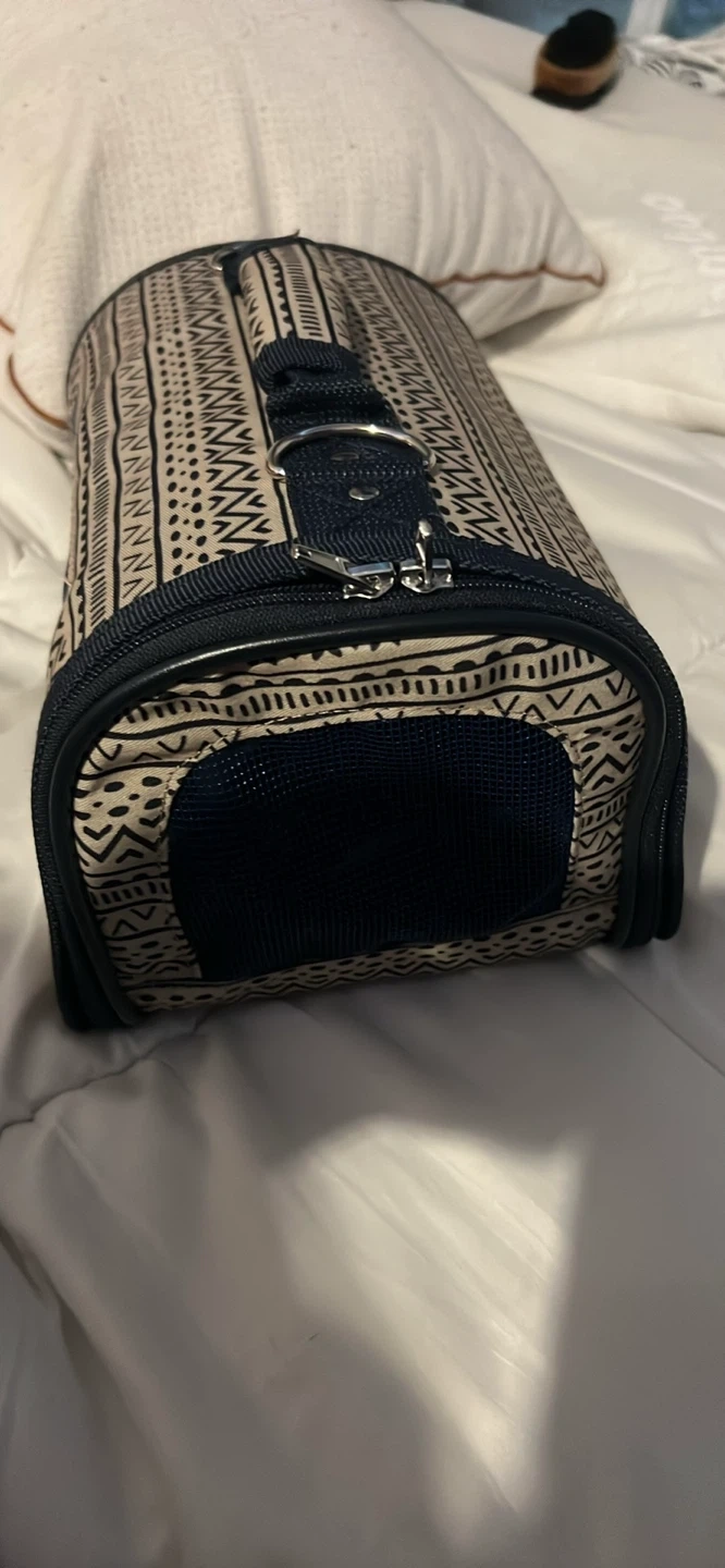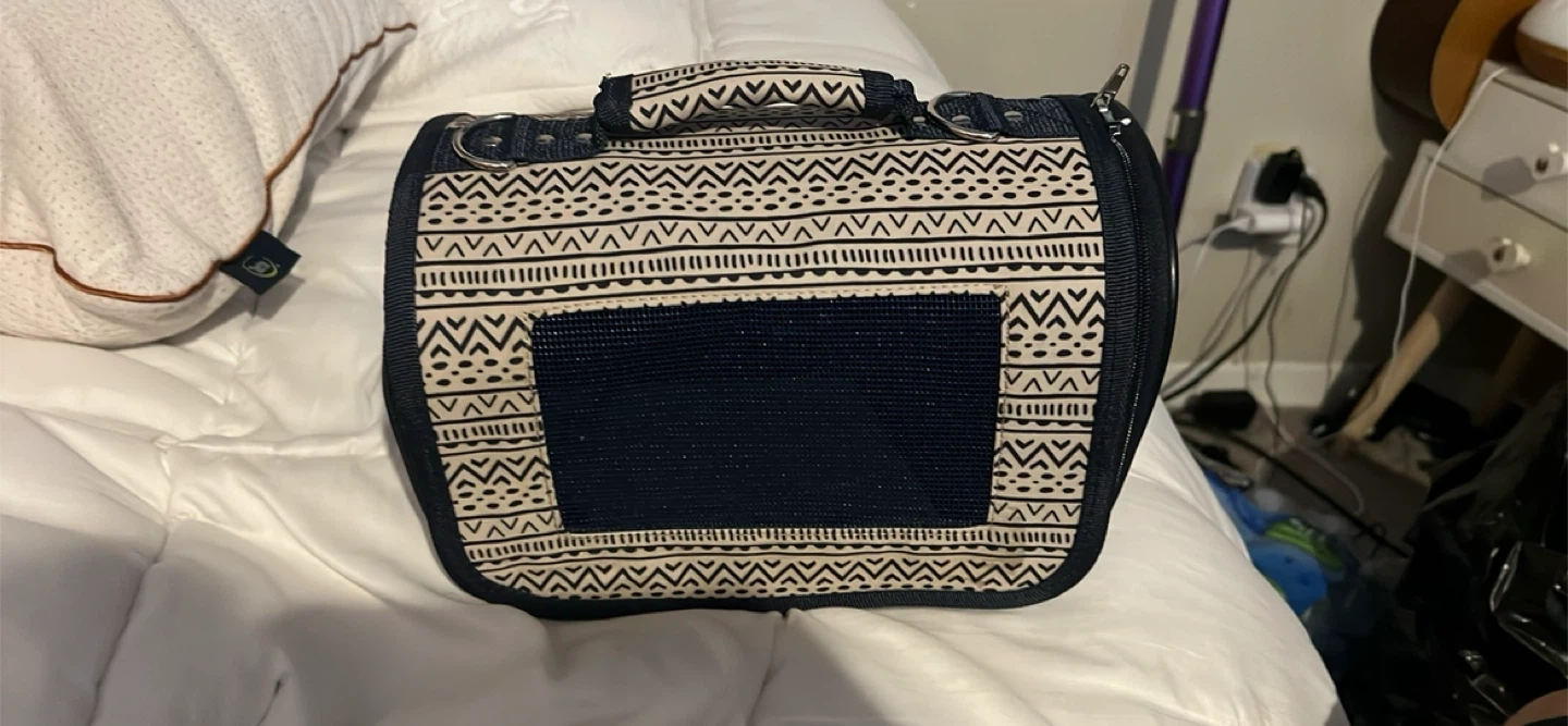 Selling a pet carrier in excellent condition! It features a stylish patterned design and a sturdy build. Perfect for taking your furry friend on adventures or to the vet. It has a handle on top and a shoulder strap for easy carrying. It is mainly for kittens or other small pets!