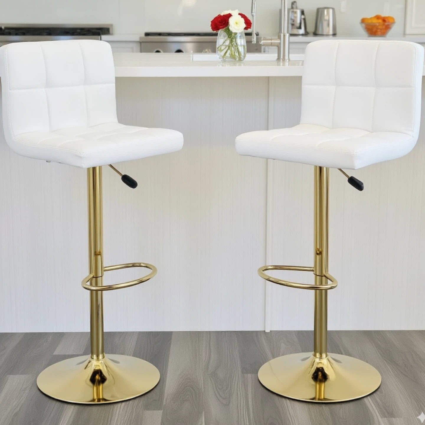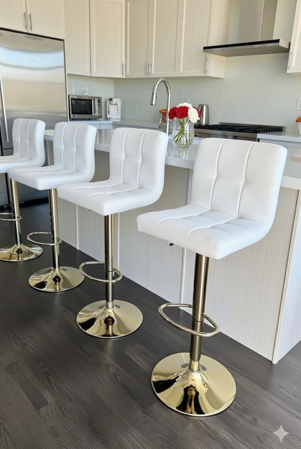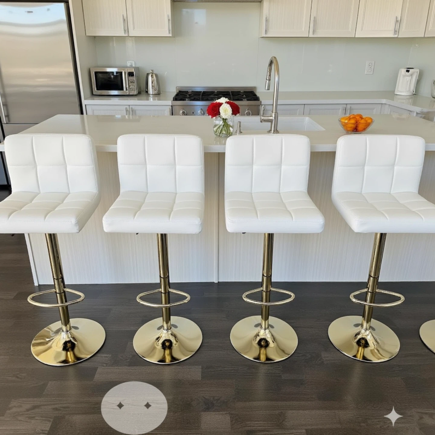 Looking to add a touch of glam to your kitchen? I'm selling a set of four stylish bar stools! They feature a sleek white seat and a shiny gold base, perfect for any modern kitchen or bar area. They are in great condition and ready to elevate your space!