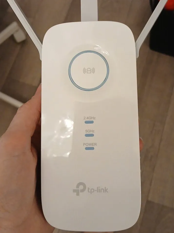 Selling a TP-Link WiFi range extender. It supports both 2.4GHz and 5GHz bands, indicated by the lights on the front. Great for boosting your WiFi signal at home!