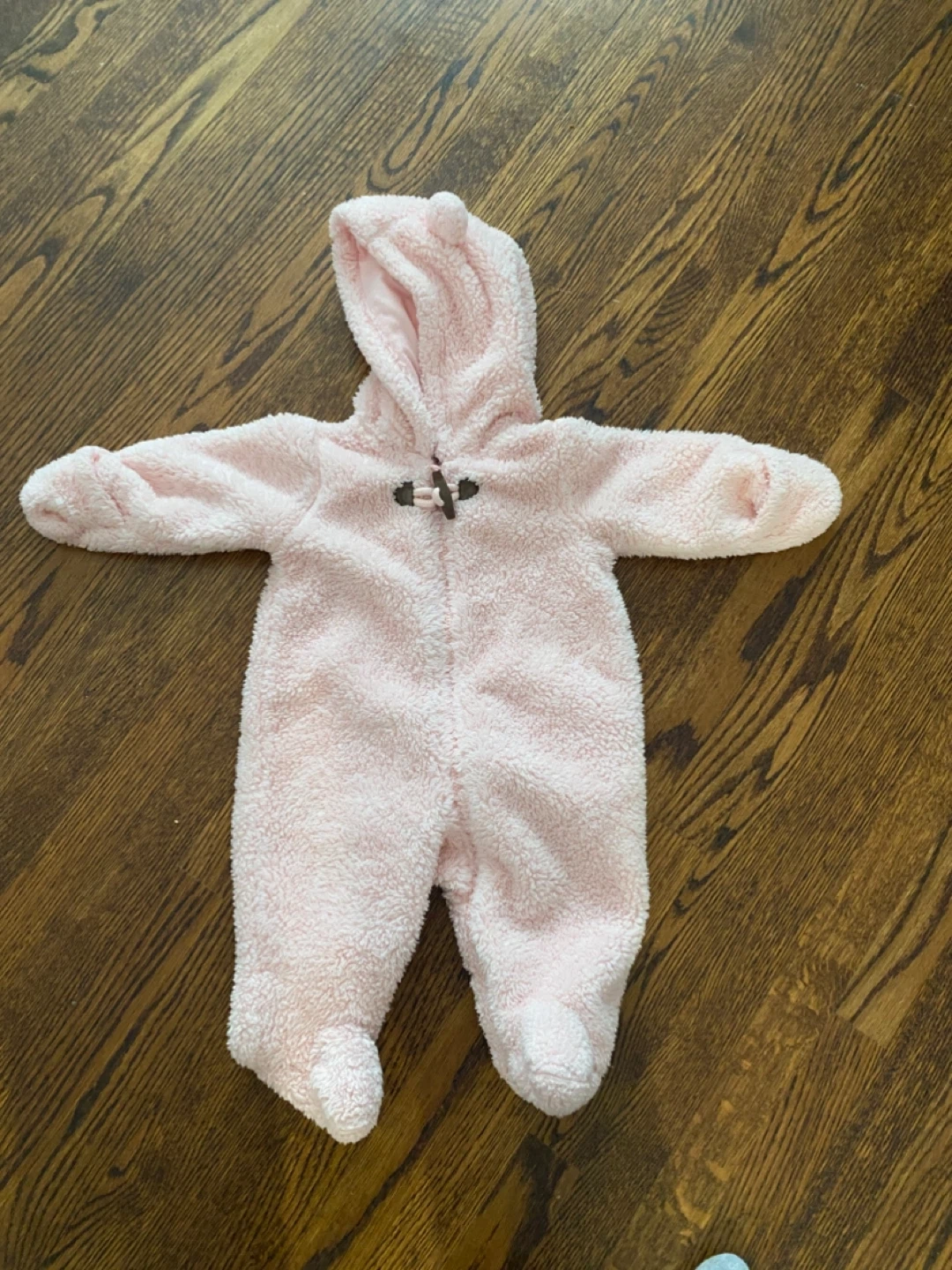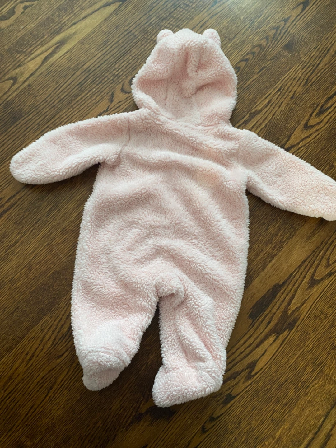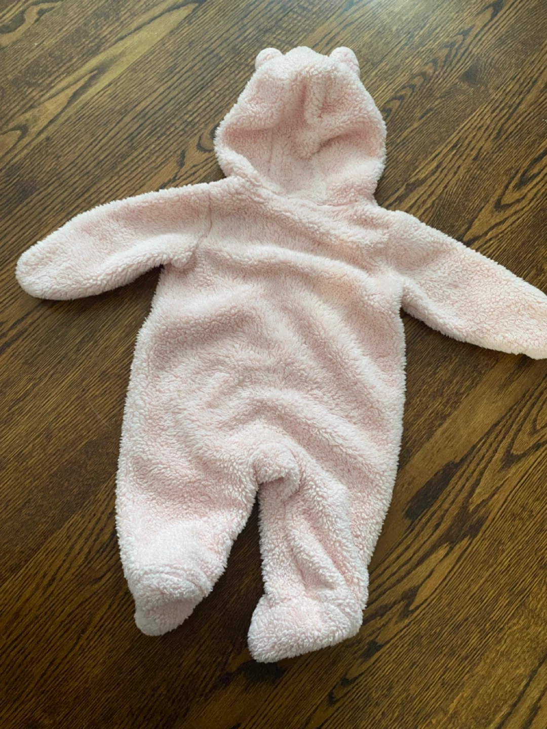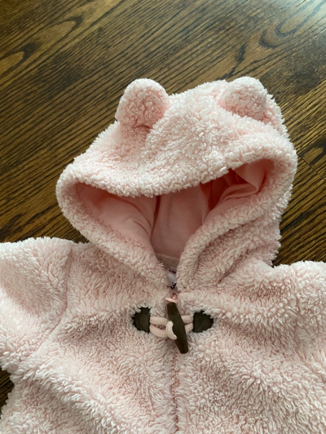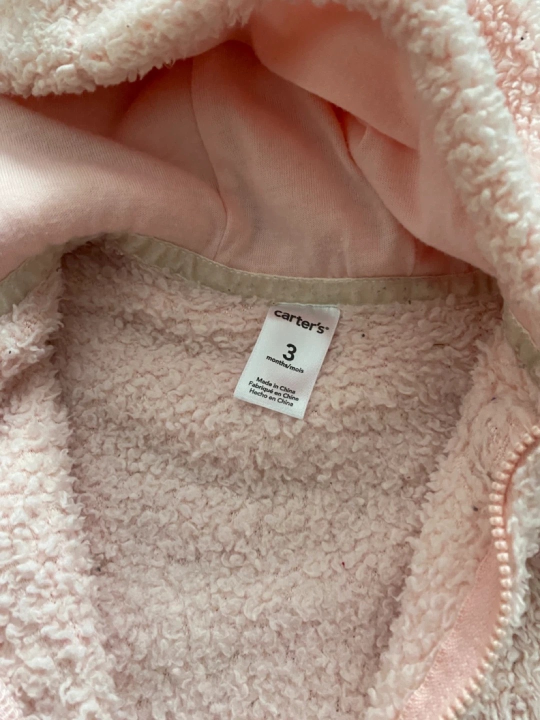 A super cute and cozy Carter's onesie for your little one! It's a soft, fuzzy pink with a hood featuring adorable bear ears. Size is 3 months (ideal for 0-3m), perfect for keeping your baby warm and snug.