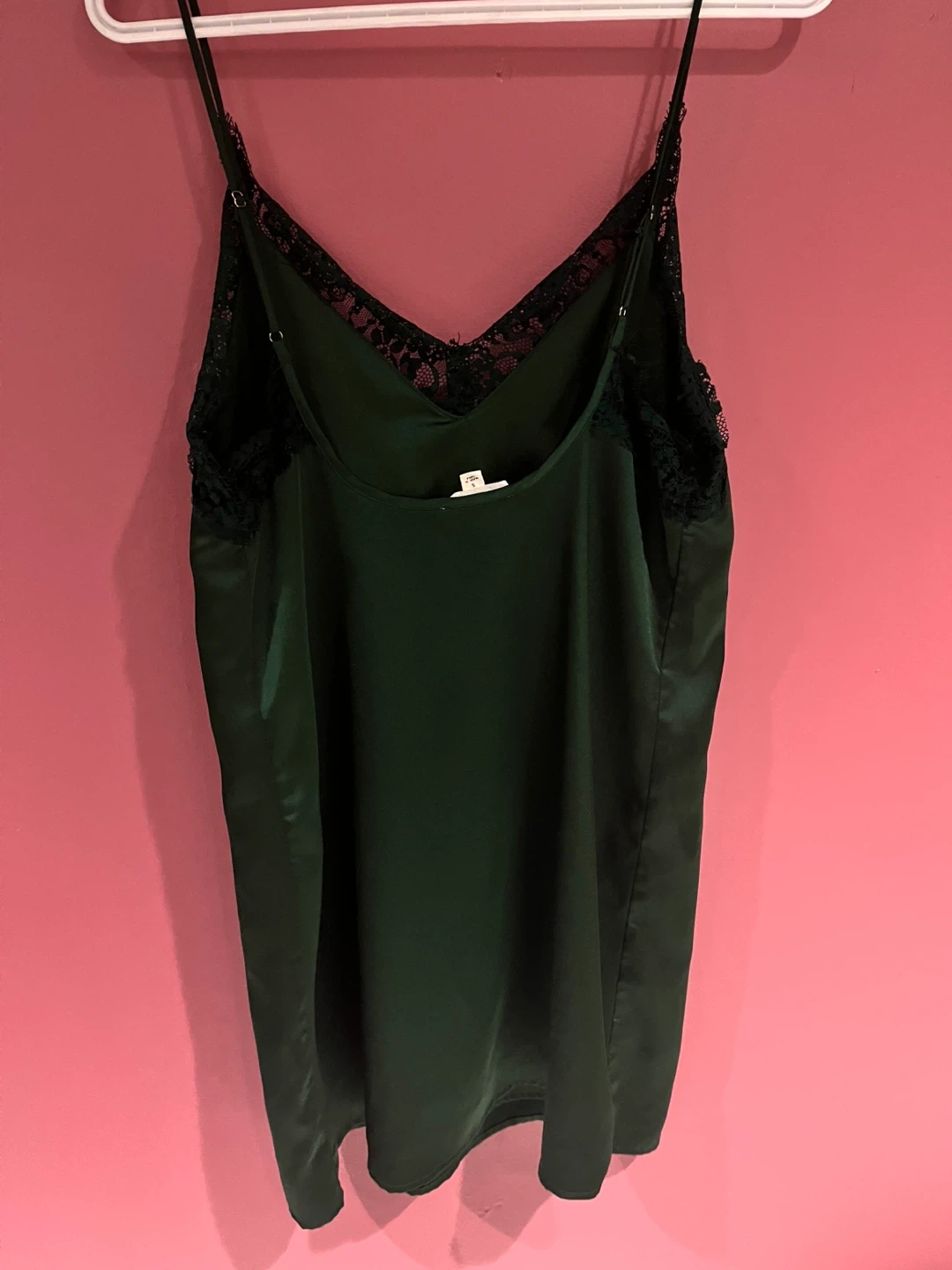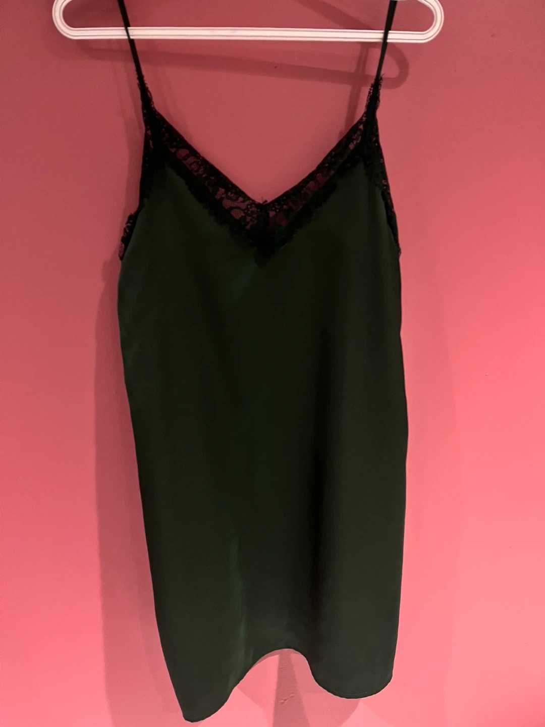 Slip dress in a lovely dark green colour with delicate black lace trim. Size small.