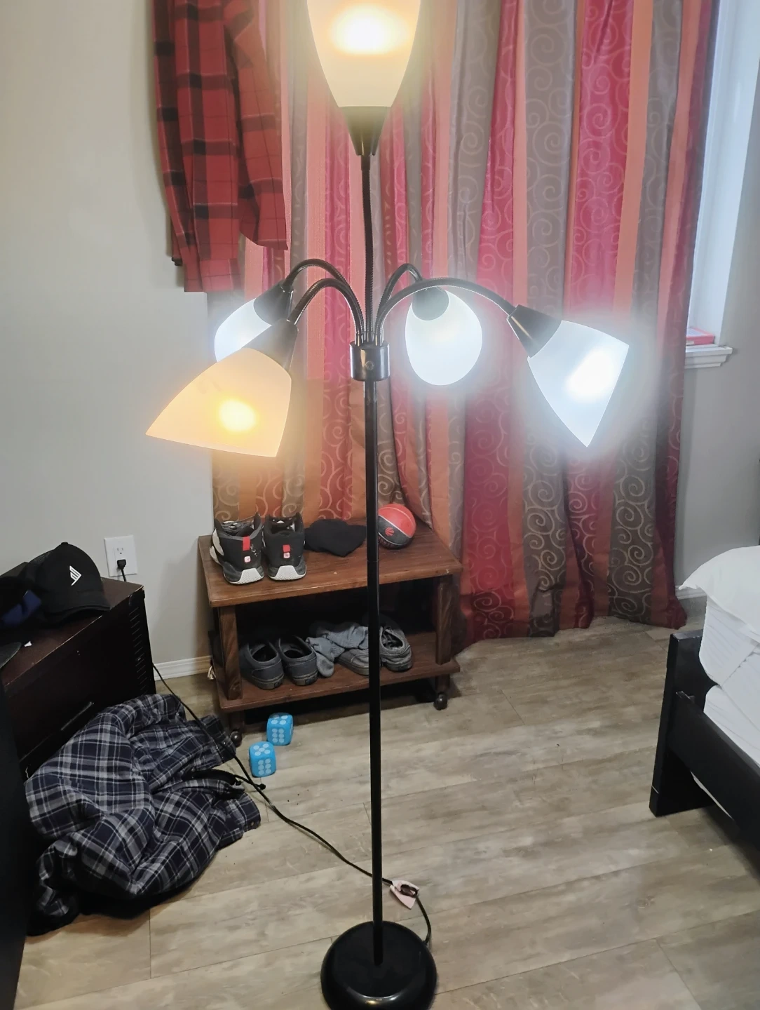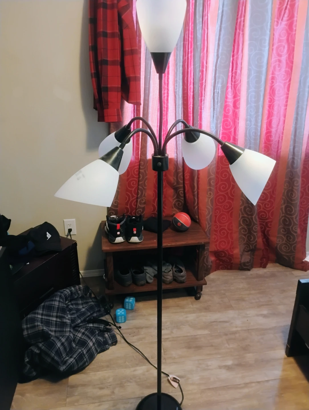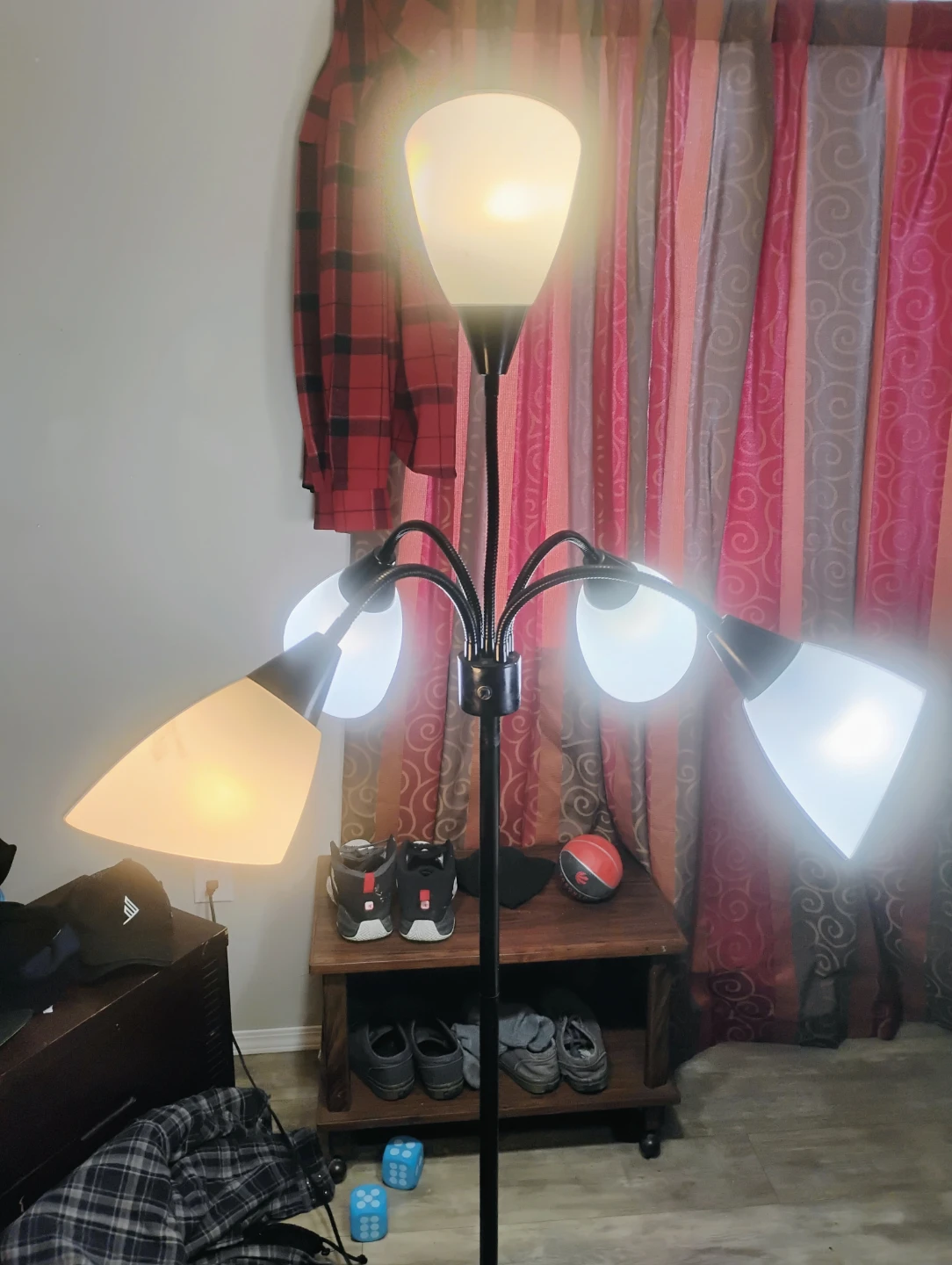 Here's a floor lamp with five adjustable lights! It's in great shape and provides ample lighting for any room. Perfect for creating a cozy atmosphere or for task lighting