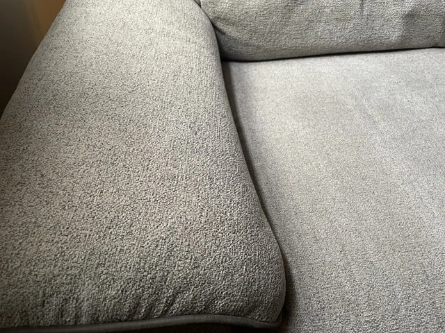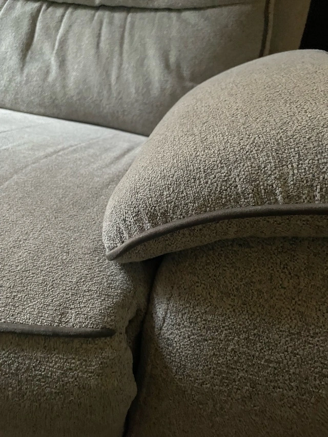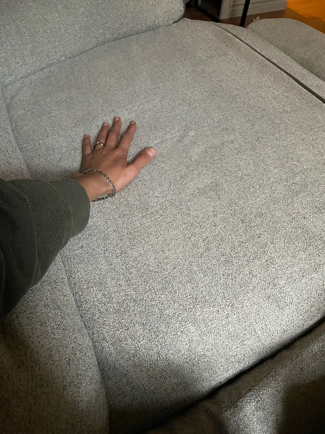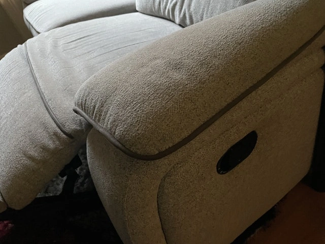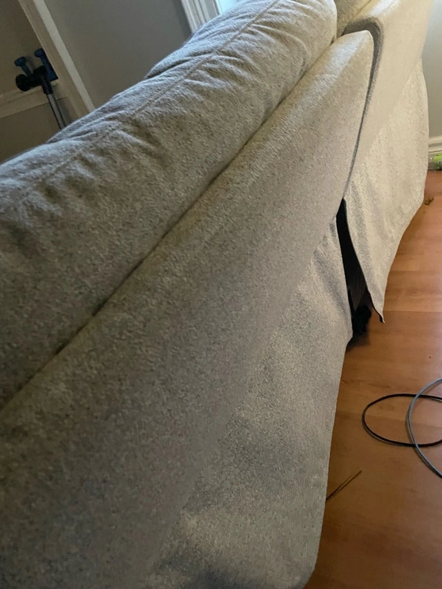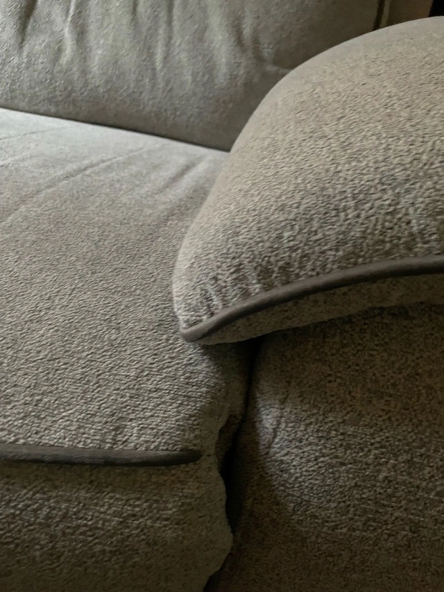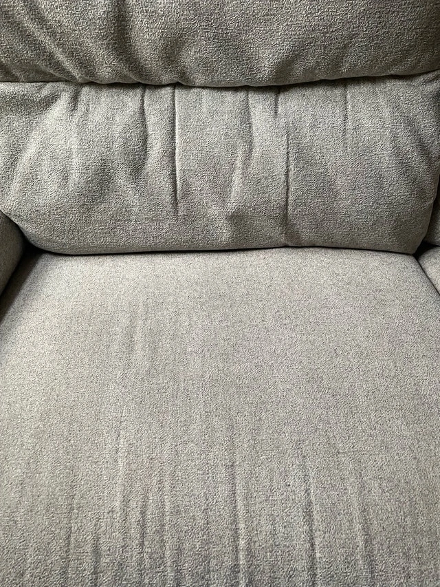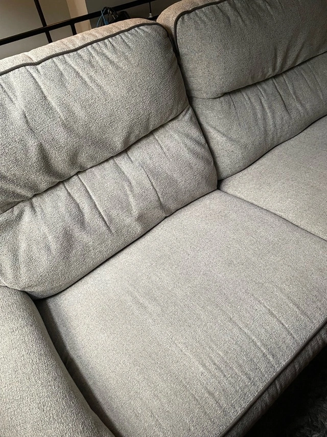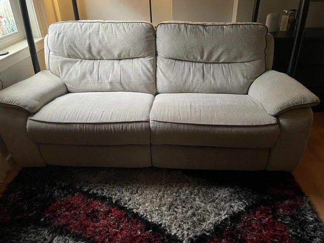 Super clean, no stains, no damages. Wasn’t used much and well taken care of. 79 inches long which is the size of a full three seater couch. The backs come off so it’s easier to move, reclines to a seated or full lay position, light Grey colour towel type texture to the fabric