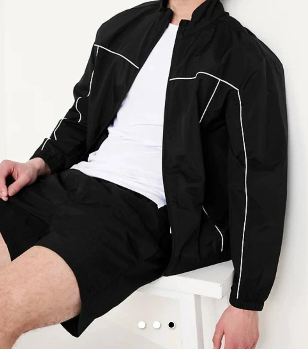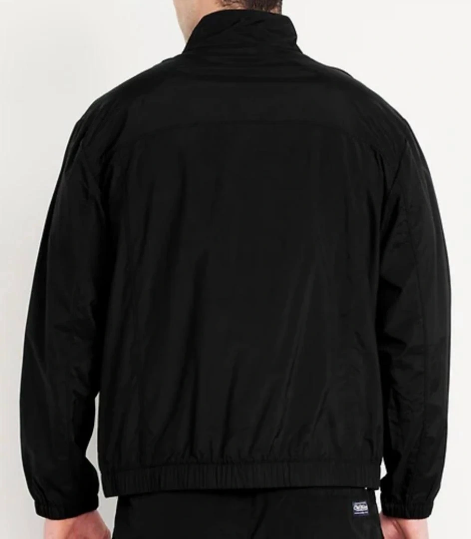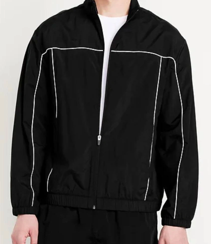 Stylish black track jacket featuring a clean design with white trim. LARGE size.