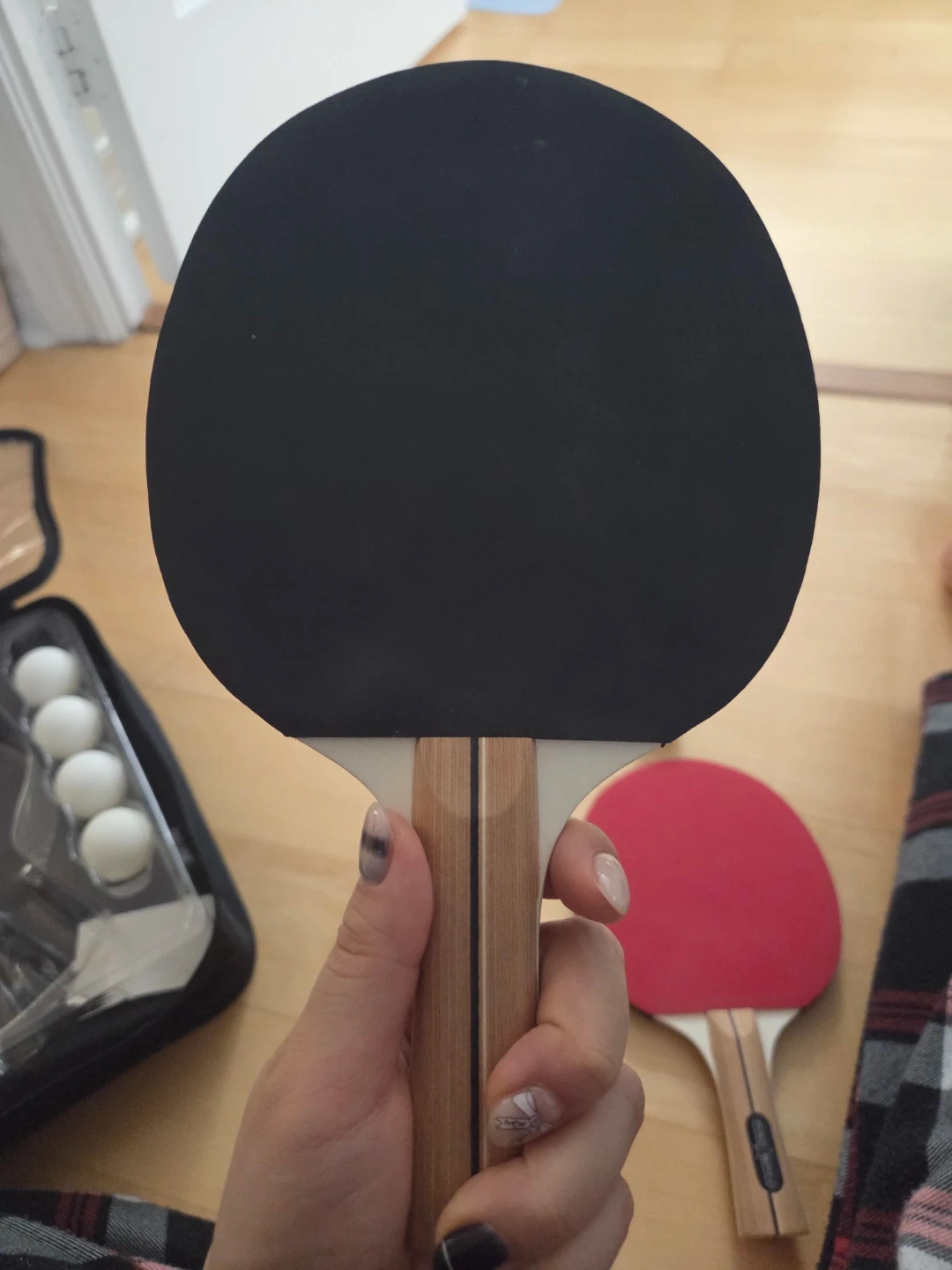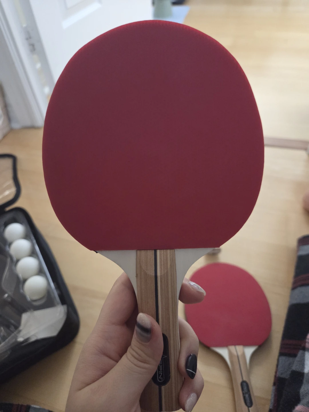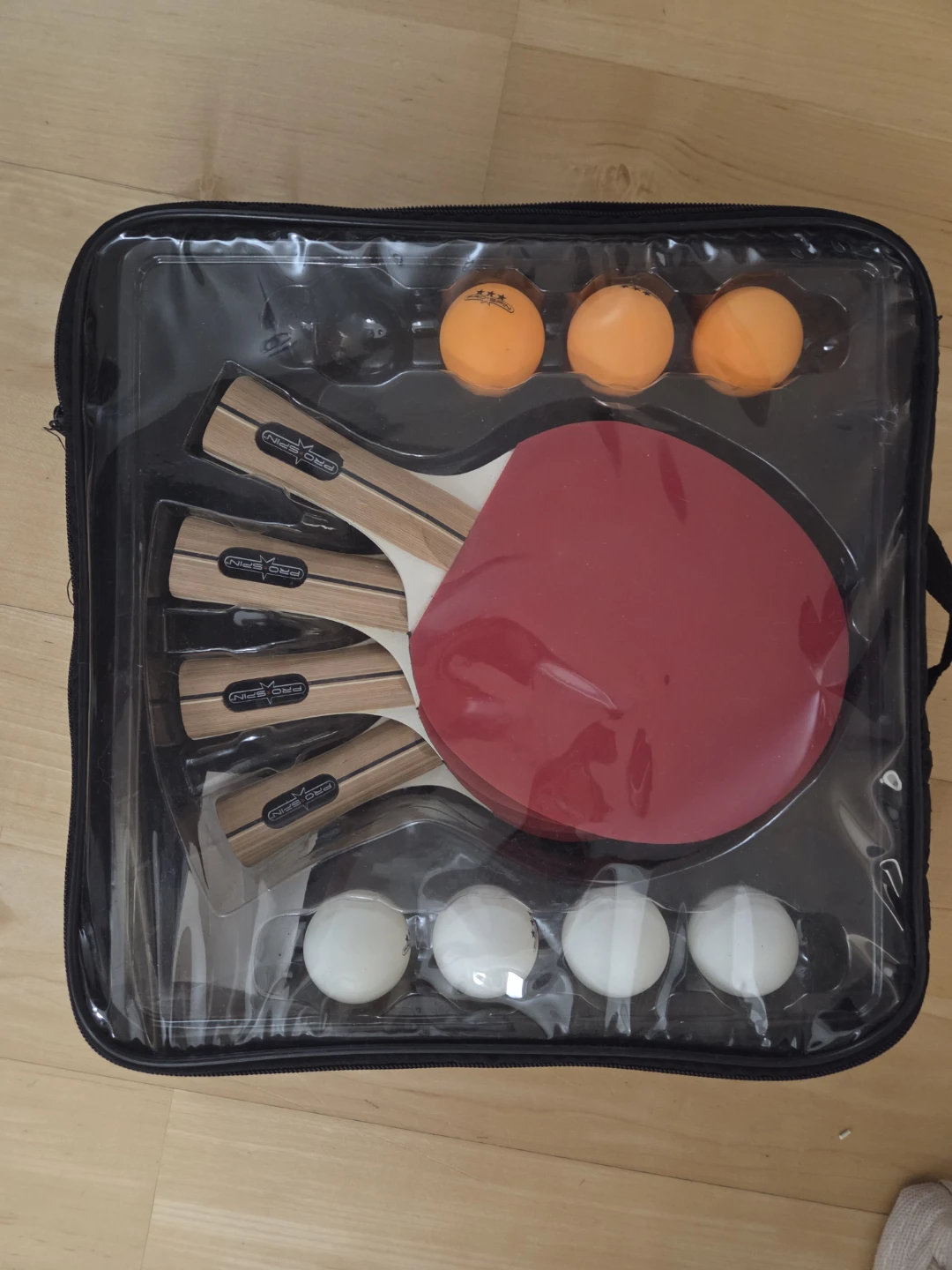 It comes with four paddles and several balls, all neatly stored in a convenient carrying case. Great for some fun with friends and family!
