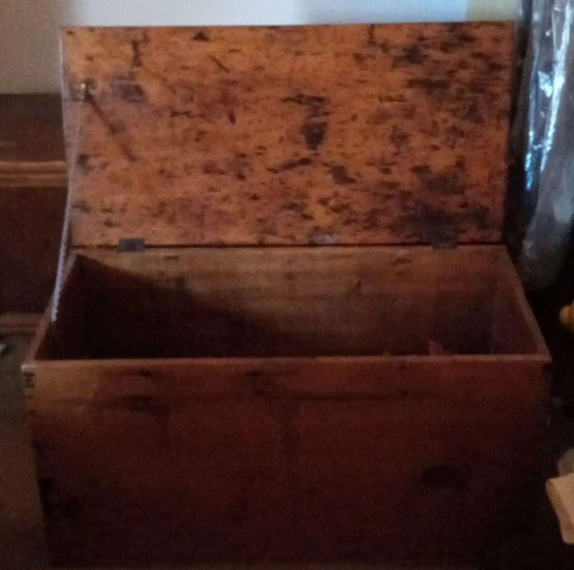 Selling a wooden storage chest. It has a hinged lid and is made of wood. It shows some signs of wear and use.