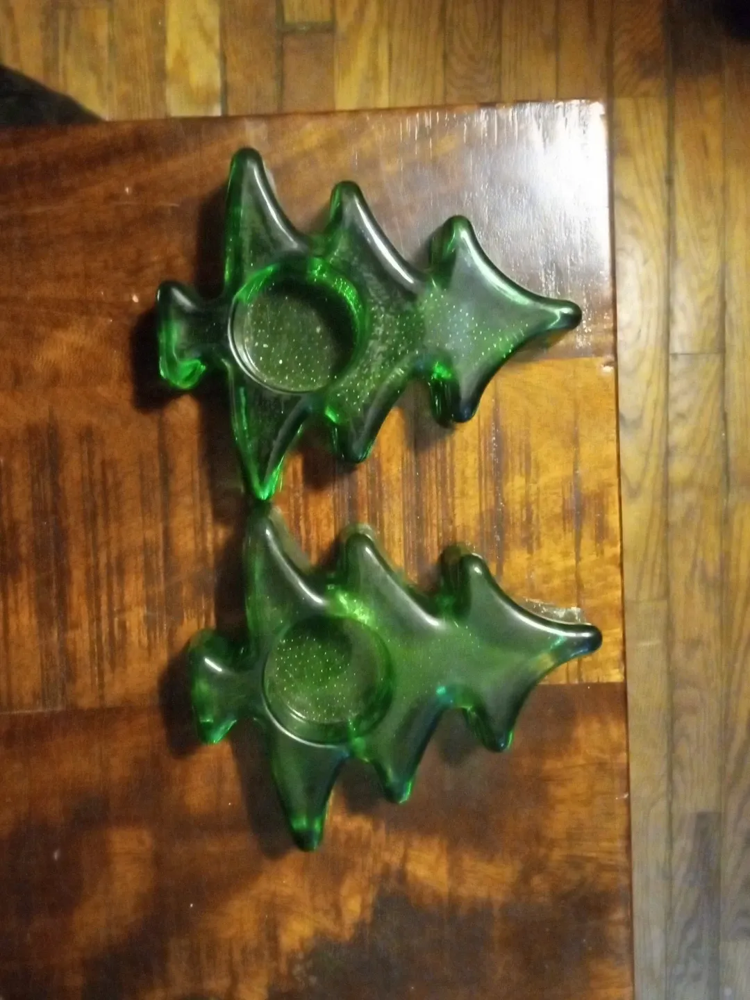 Selling a set of two green Christmas tree shaped candle holders. They'd be perfect for adding a festive touch to your holiday decor