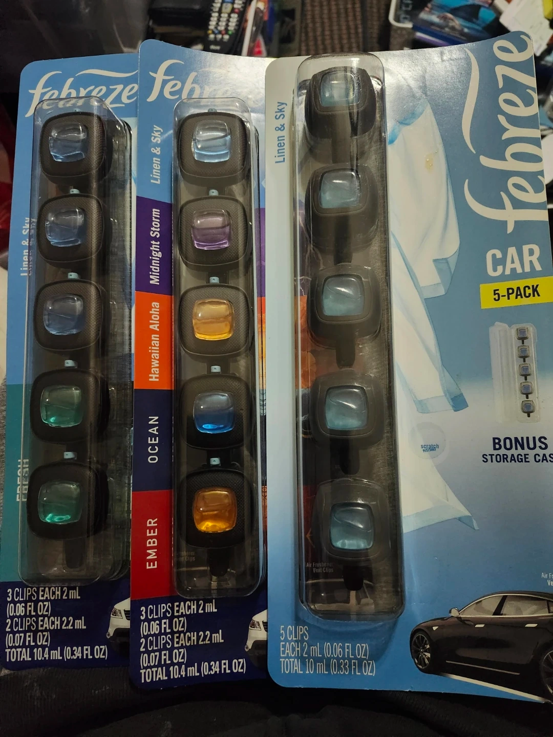 Selling a set of Febreze car air fresheners! This includes a 5-pack of Linen & Sky scent, plus some packs with other scents like Midnight Storm, Hawaiian Aloha, Ocean, and Ember. They each contain a total of 10 mL (0.34 FL OZ). 15 air freshners in total.