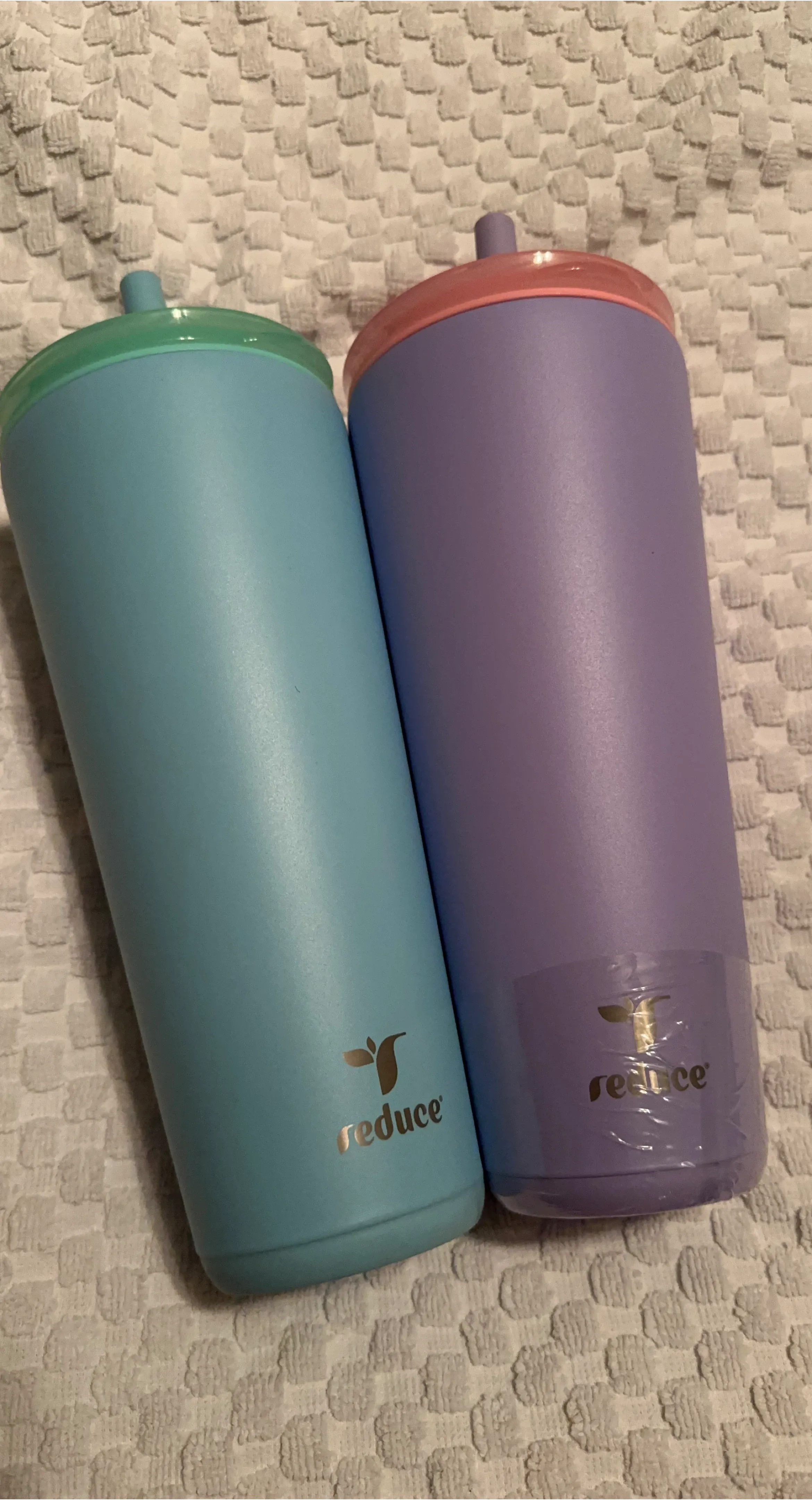 I have a set of two Reduce Cold1 tumblers for sale! They are in new condition and ready to keep your drinks cold. One is a pretty turquoise colour, and the other is lavender and pink.