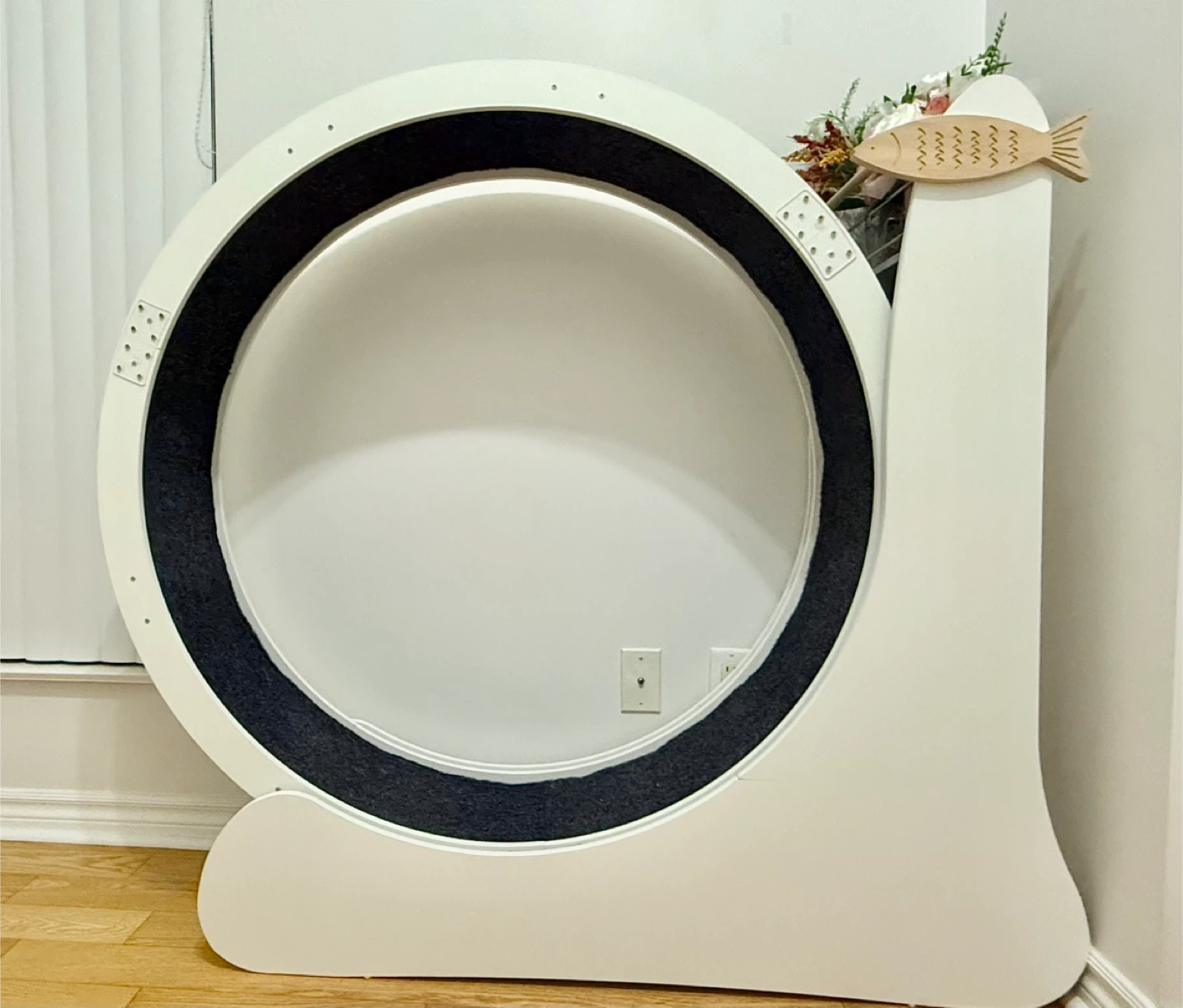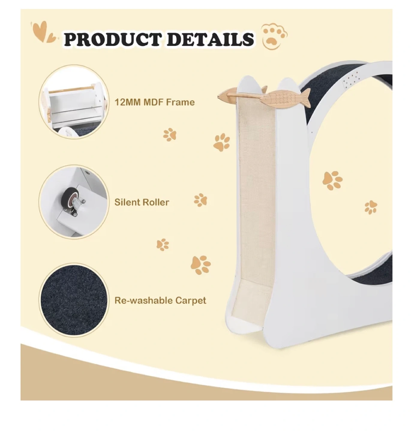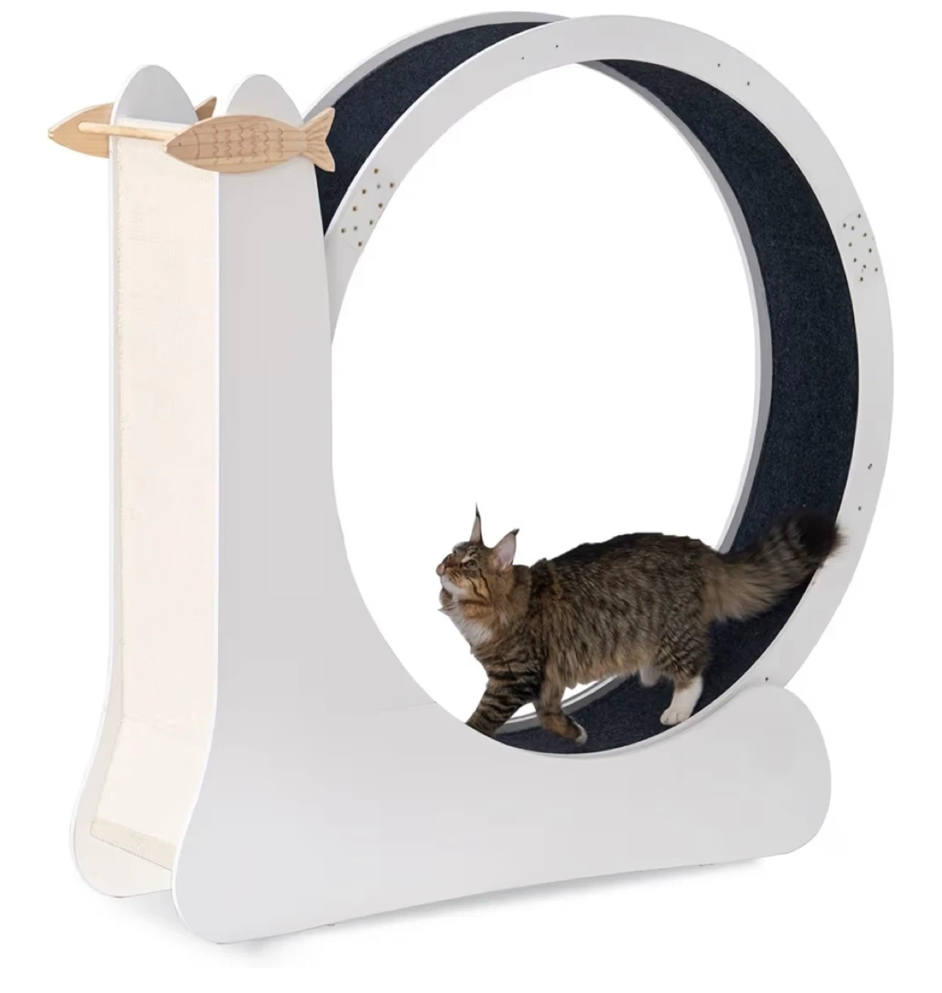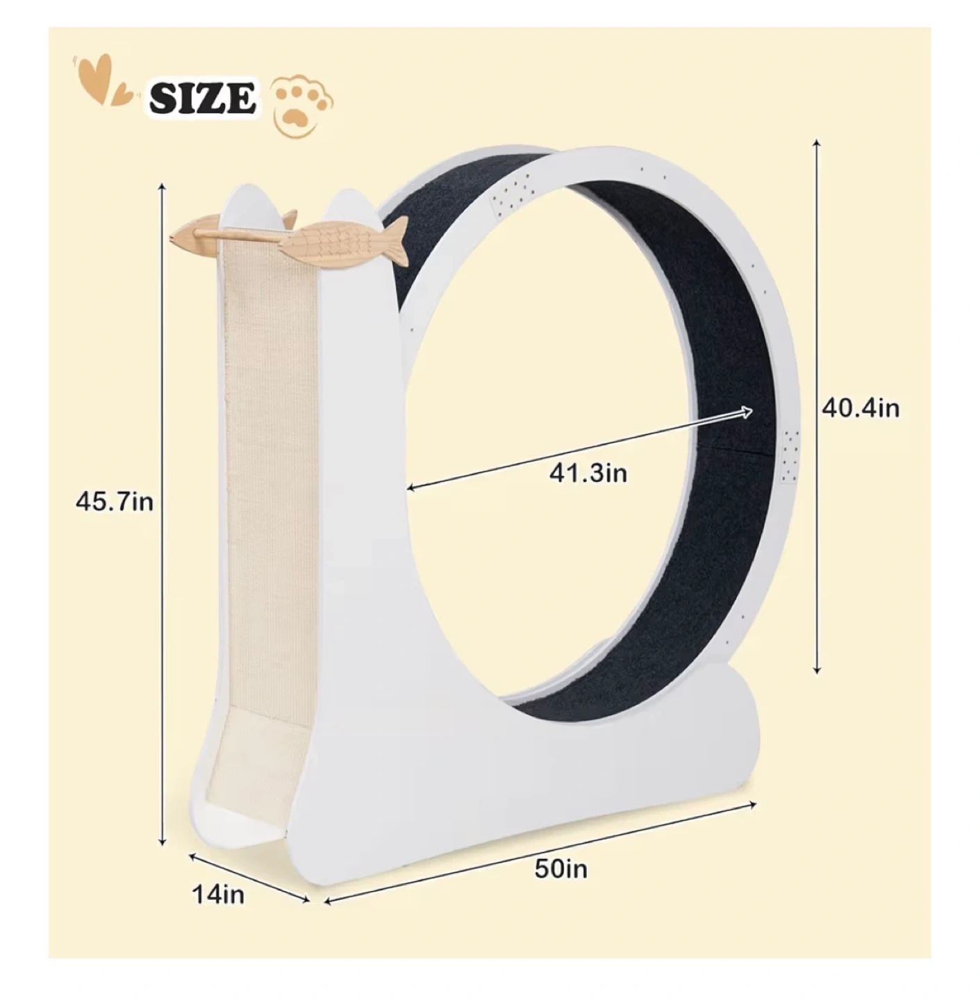 Selling a cat wheel because my cat never used it so it’s assembled but new. It has a natural sisal scratching post, attracting cats to scratch. The frame is made of 12mm MDF, and it features a silent roller and re-washable carpet. Dimensions are approximately 45.7in tall, 41.3in wide, and 50in long.