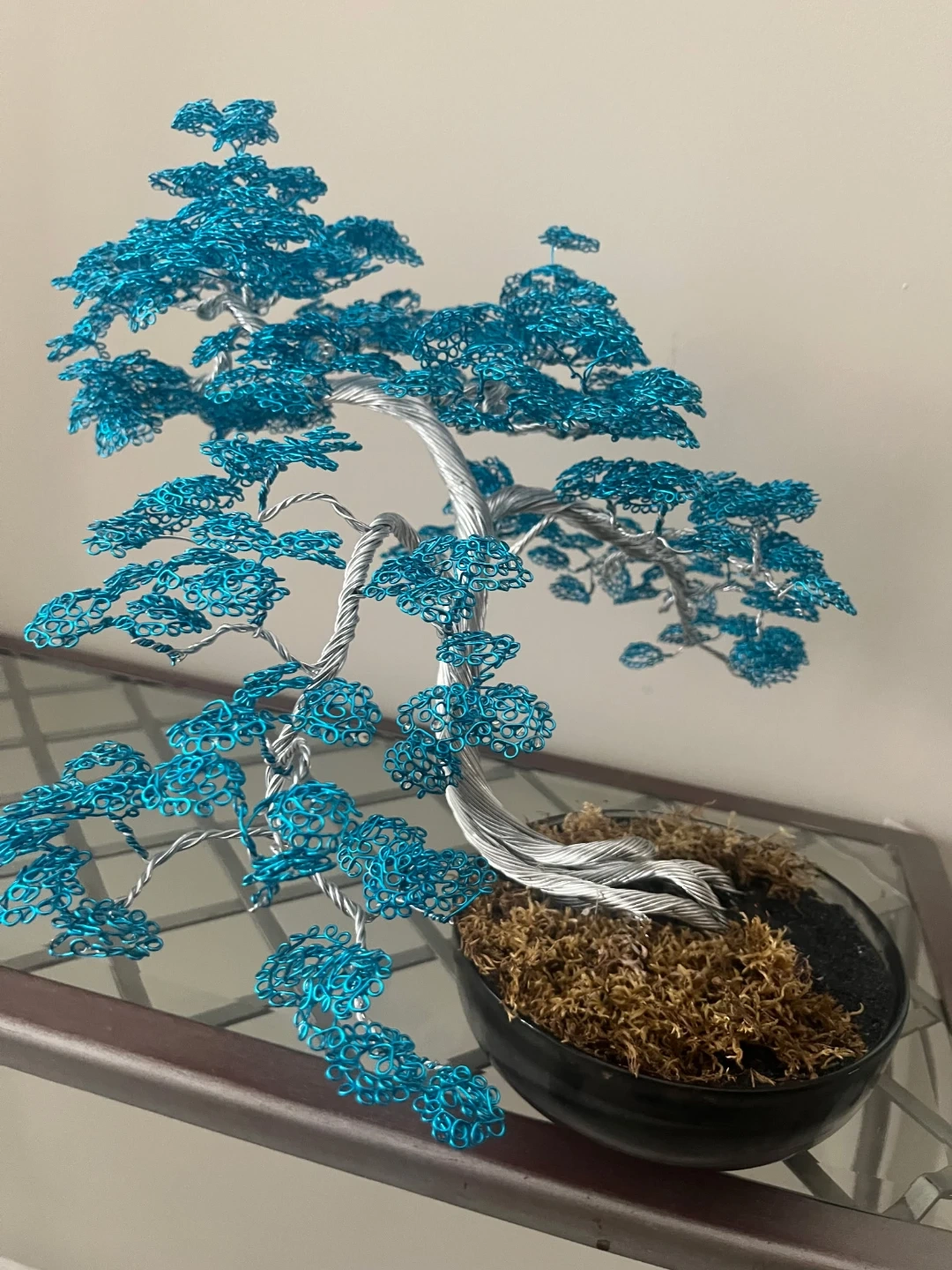 This is a unique bonsai tree sculpture made from wire. The leaves are a vibrant blue, and the trunk is silver. It's a beautiful piece of art that would look great in any home