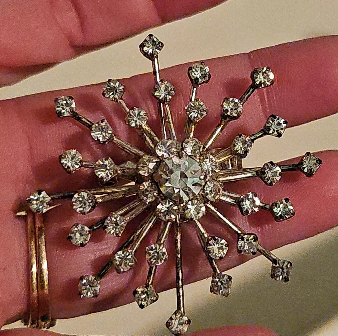 Selling a vintage snowflake brooch. It features a central clear stone surrounded by radiating arms, each adorned with smaller clear stones. The metal appears to be a gold tone. It's in good condition!