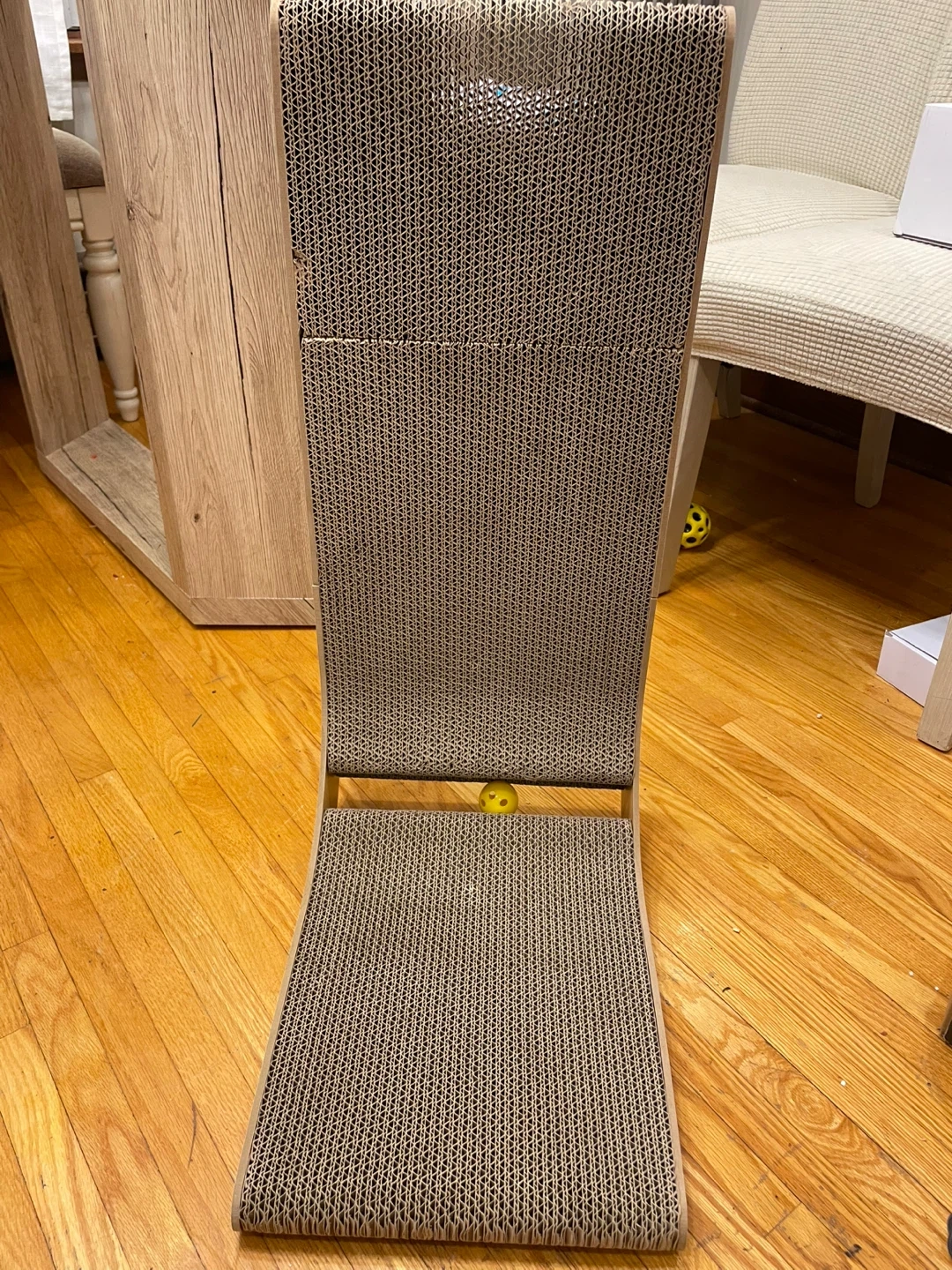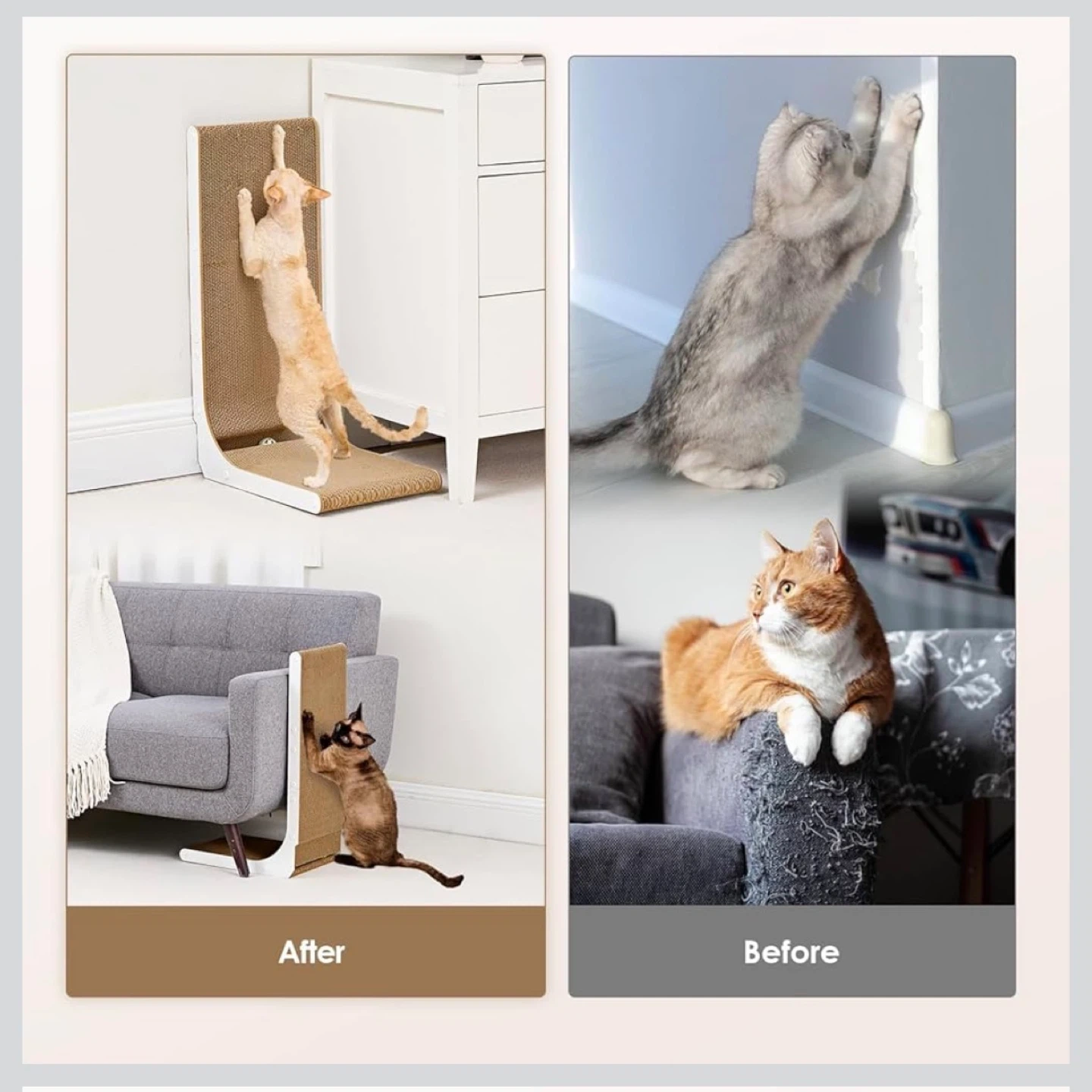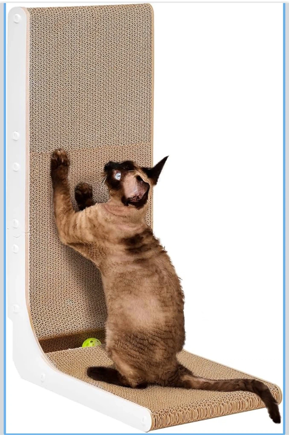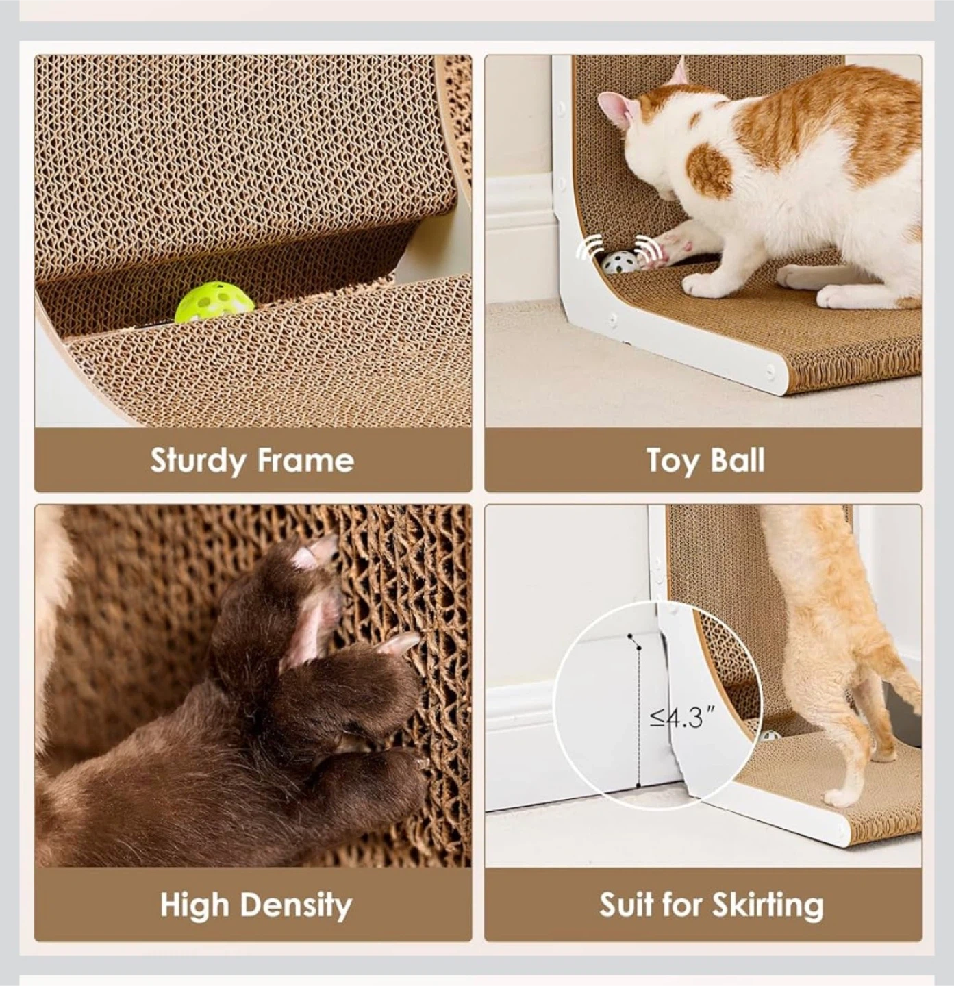 This is a cat scratching post, perfect for keeping your kitty entertained and away from your furniture! It features a sturdy frame and high-density cardboard for long-lasting use. There's even a toy ball included for added fun. It's designed to fit neatly against skirting boards, making it a great space-saving option for any home