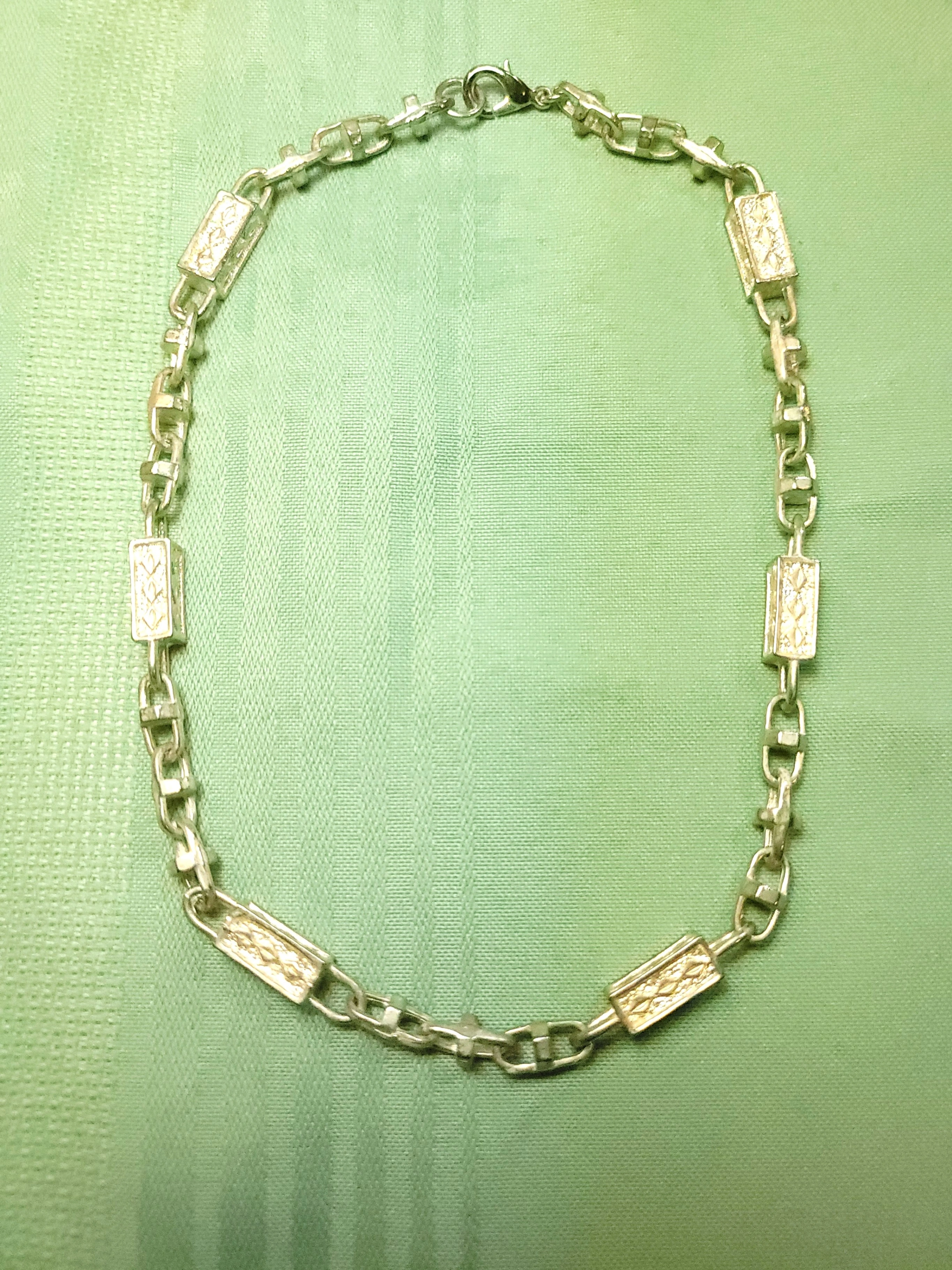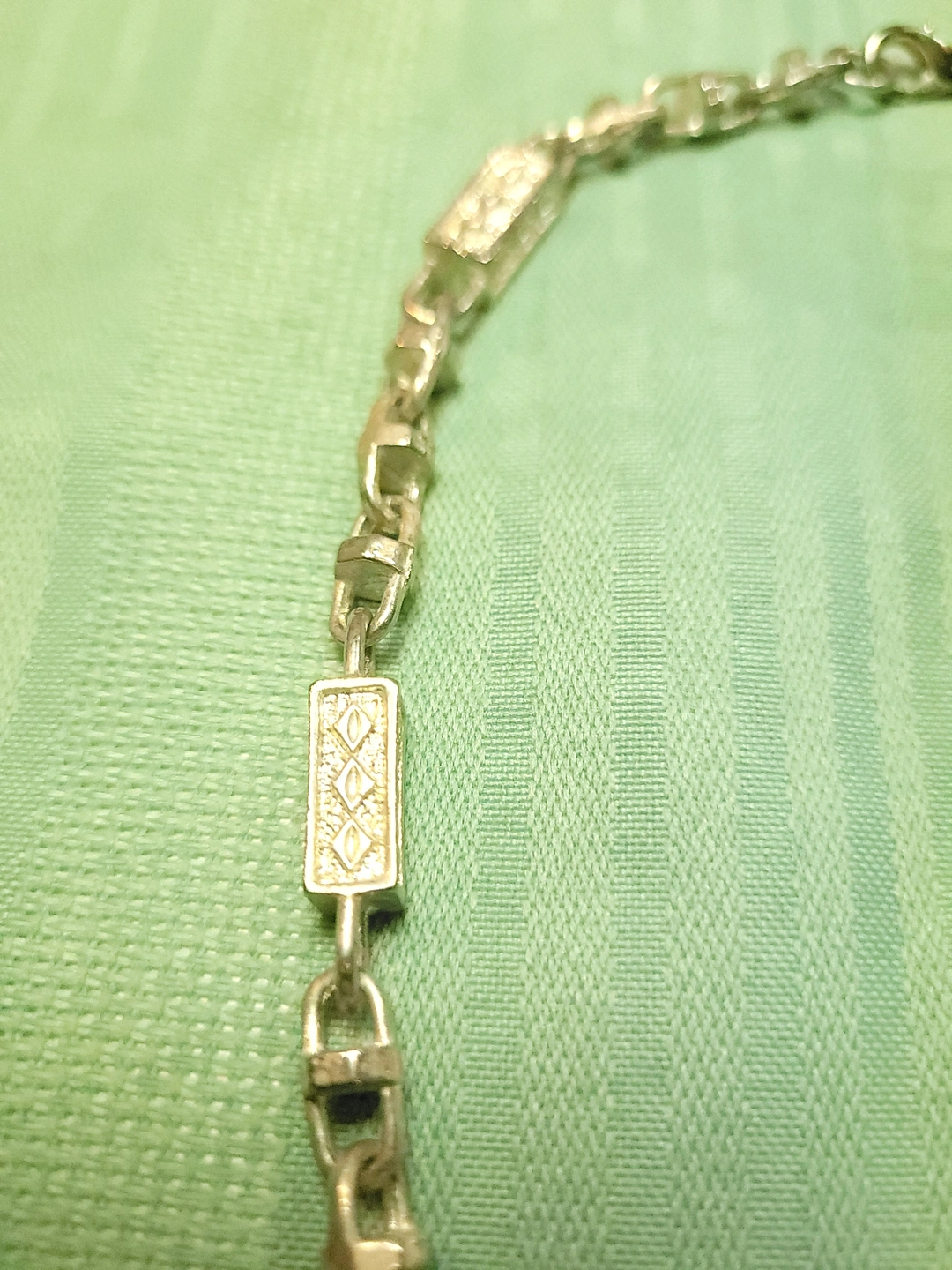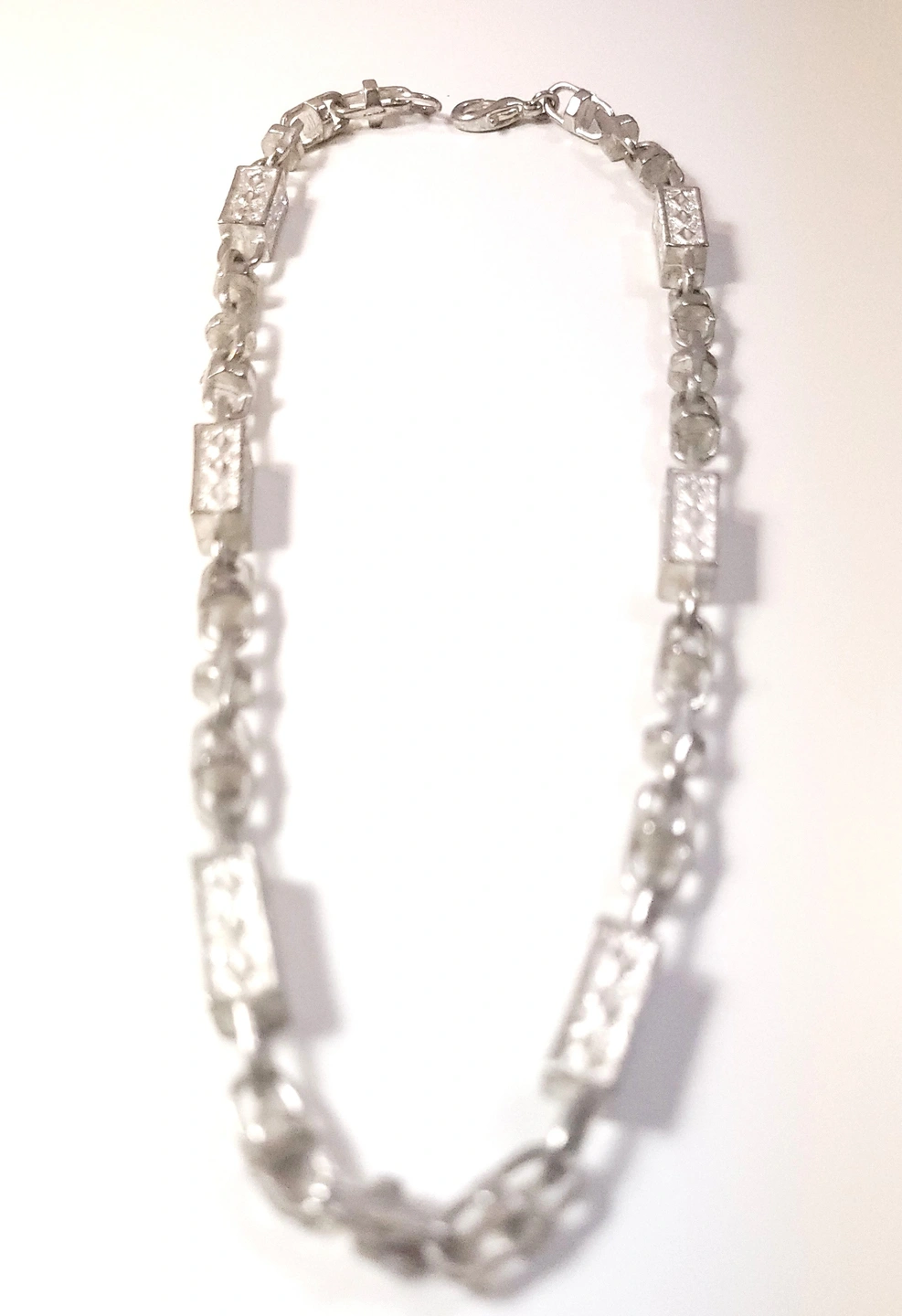Condition: The necklace is in good vintage condition light wear. The silver plating is remarkably bright with no visible wear-through to the base metal. The links are straight and the hinges are fluid. The lobster clasp is strong and functions perfectly.
