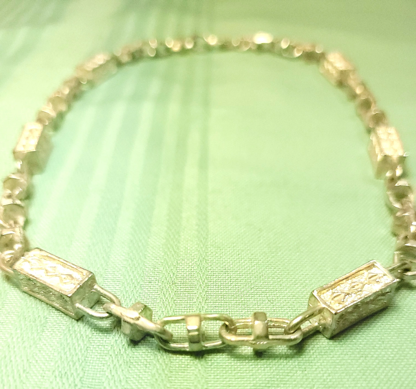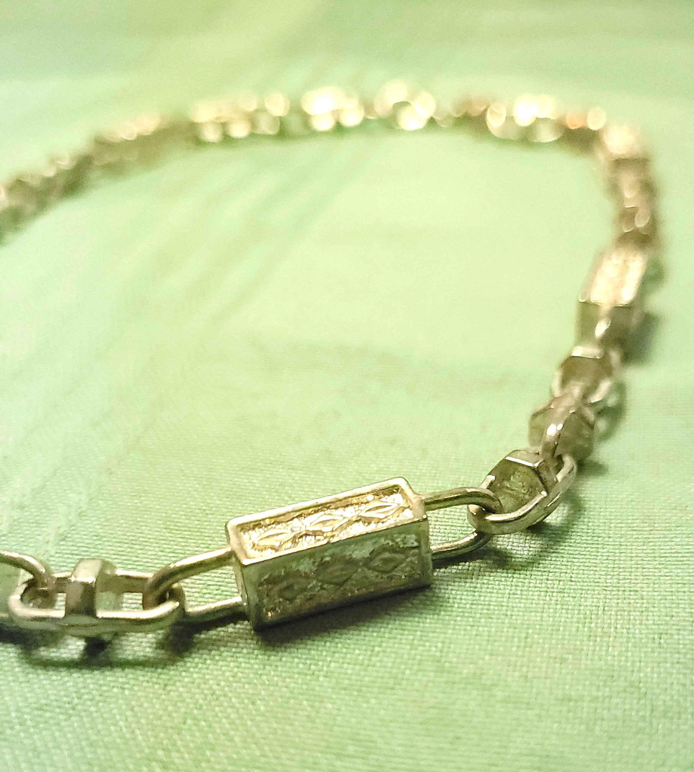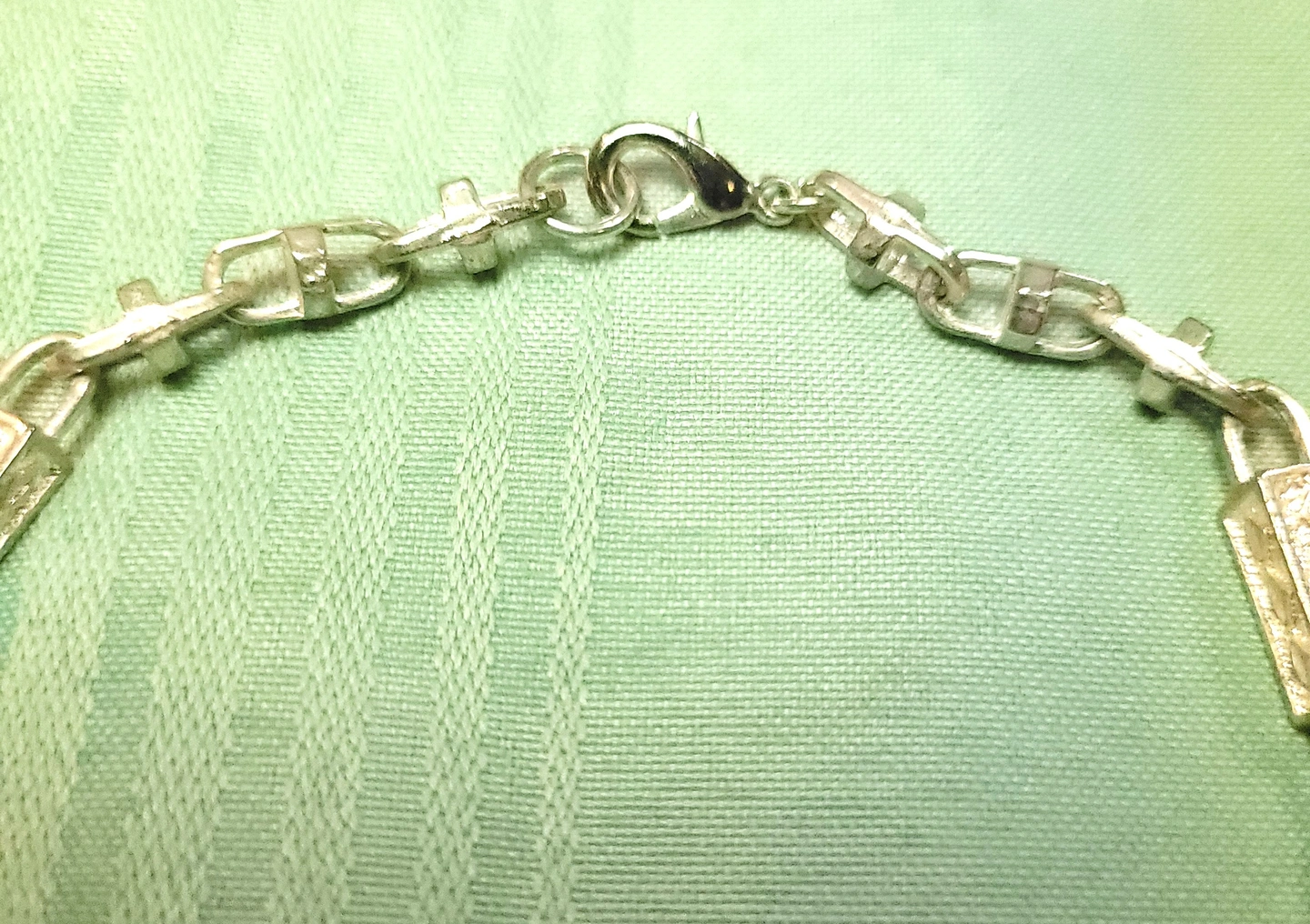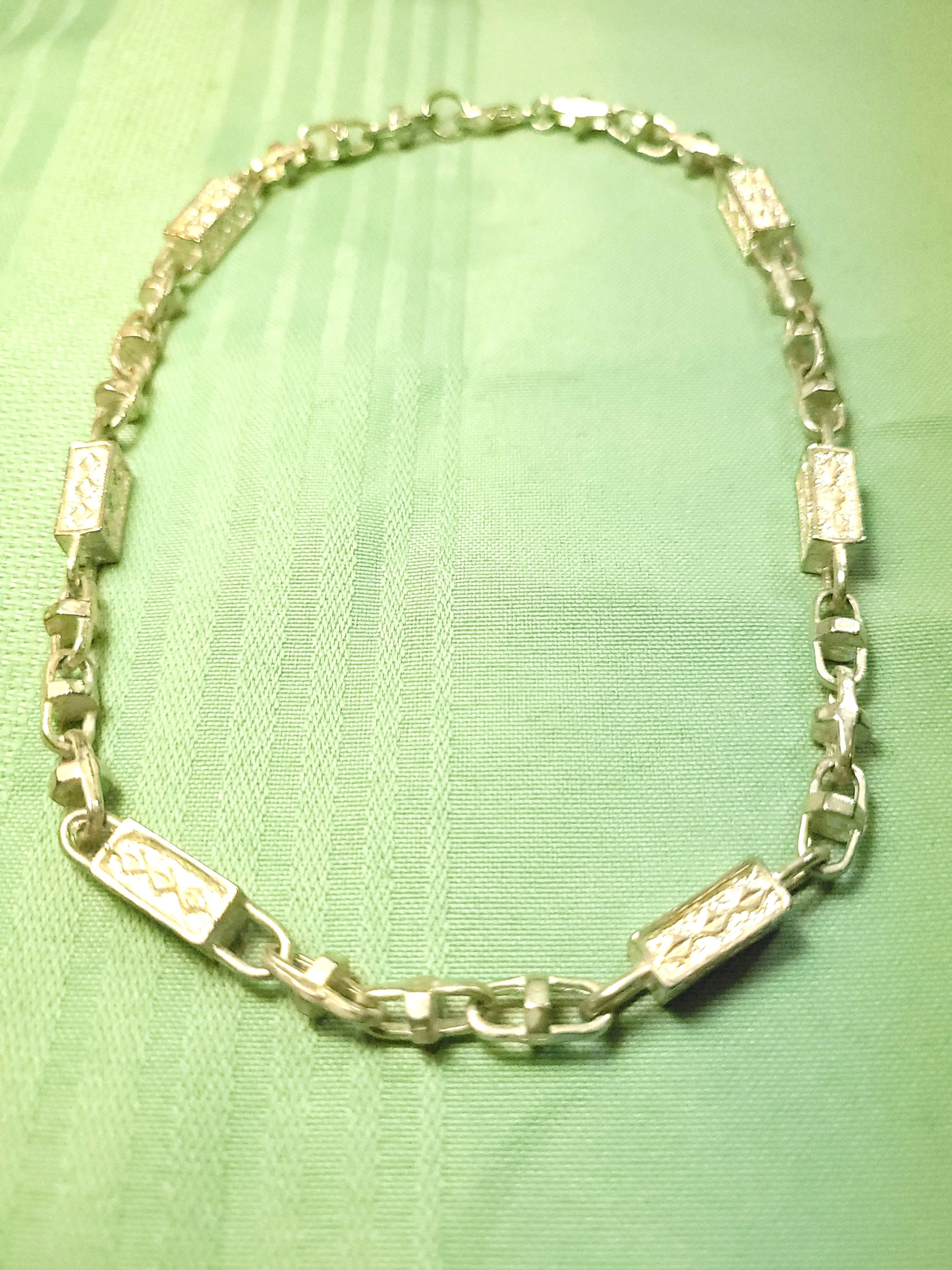 Condition: The necklace is in good vintage condition light wear. The silver plating is remarkably bright with no visible wear-through to the base metal. The links are straight and the hinges are fluid. The lobster clasp is strong and functions perfectly.