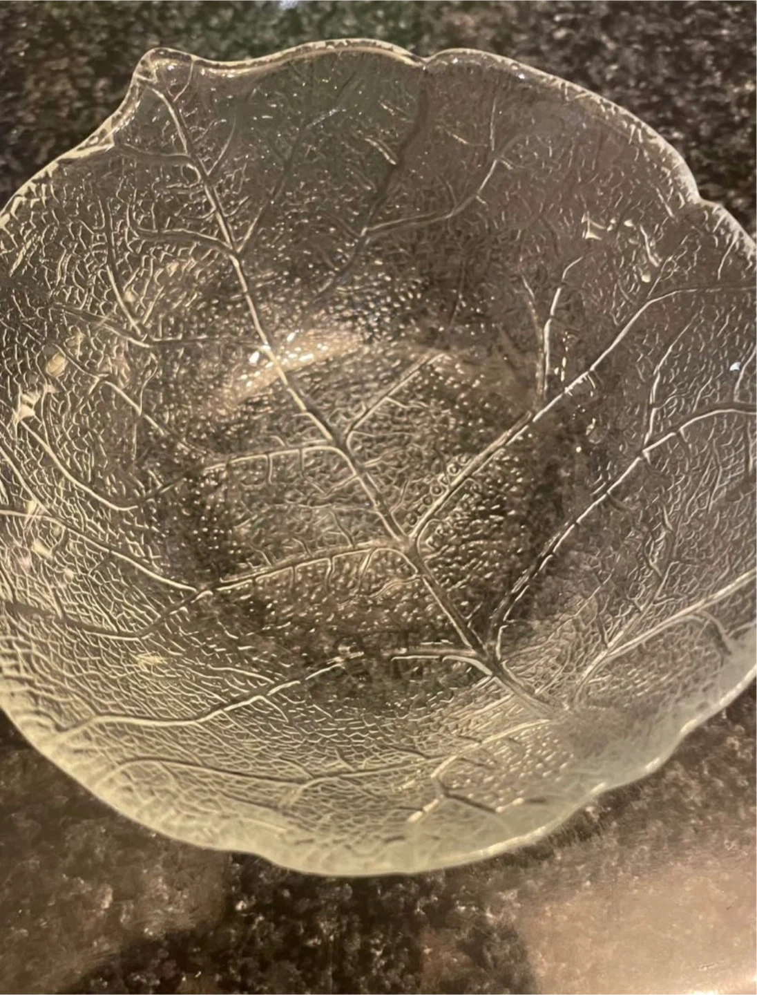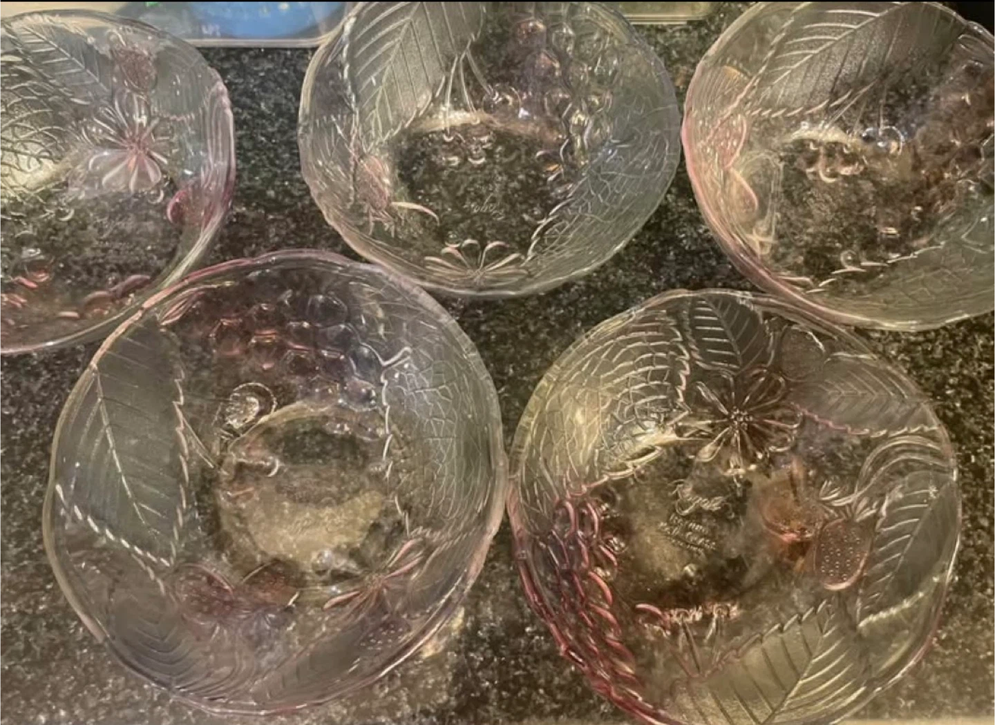 Selling a set of Royal Barium Kali Glass bowls. These bowls feature a delicate leaf and floral design, perfect for adding a touch of elegance to your table setting