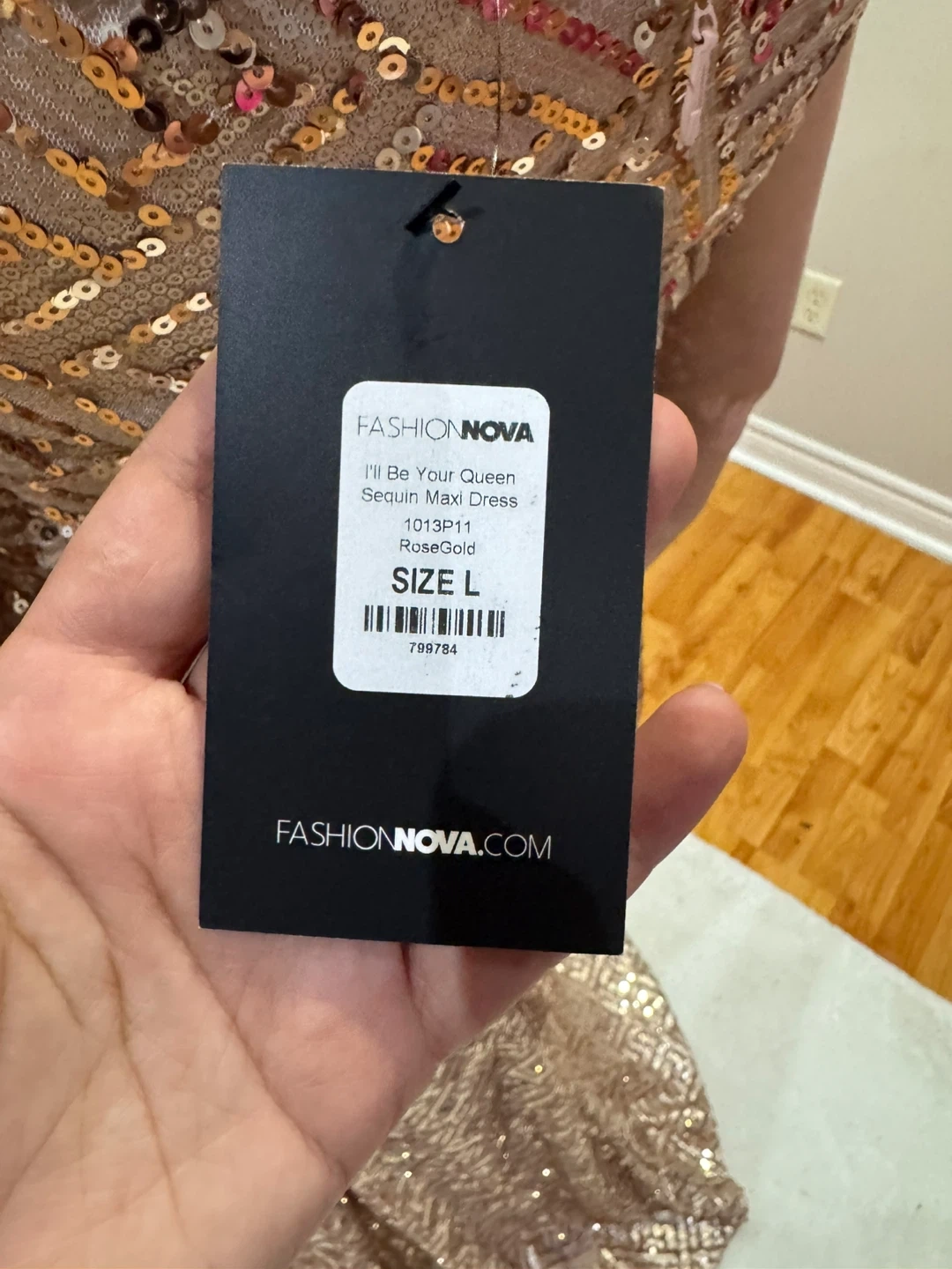 Selling a gorgeous Fashion Nova sequin maxi dress in a rose gold colour. It's a size large and has a stylish slit. Perfect for a special occasion!