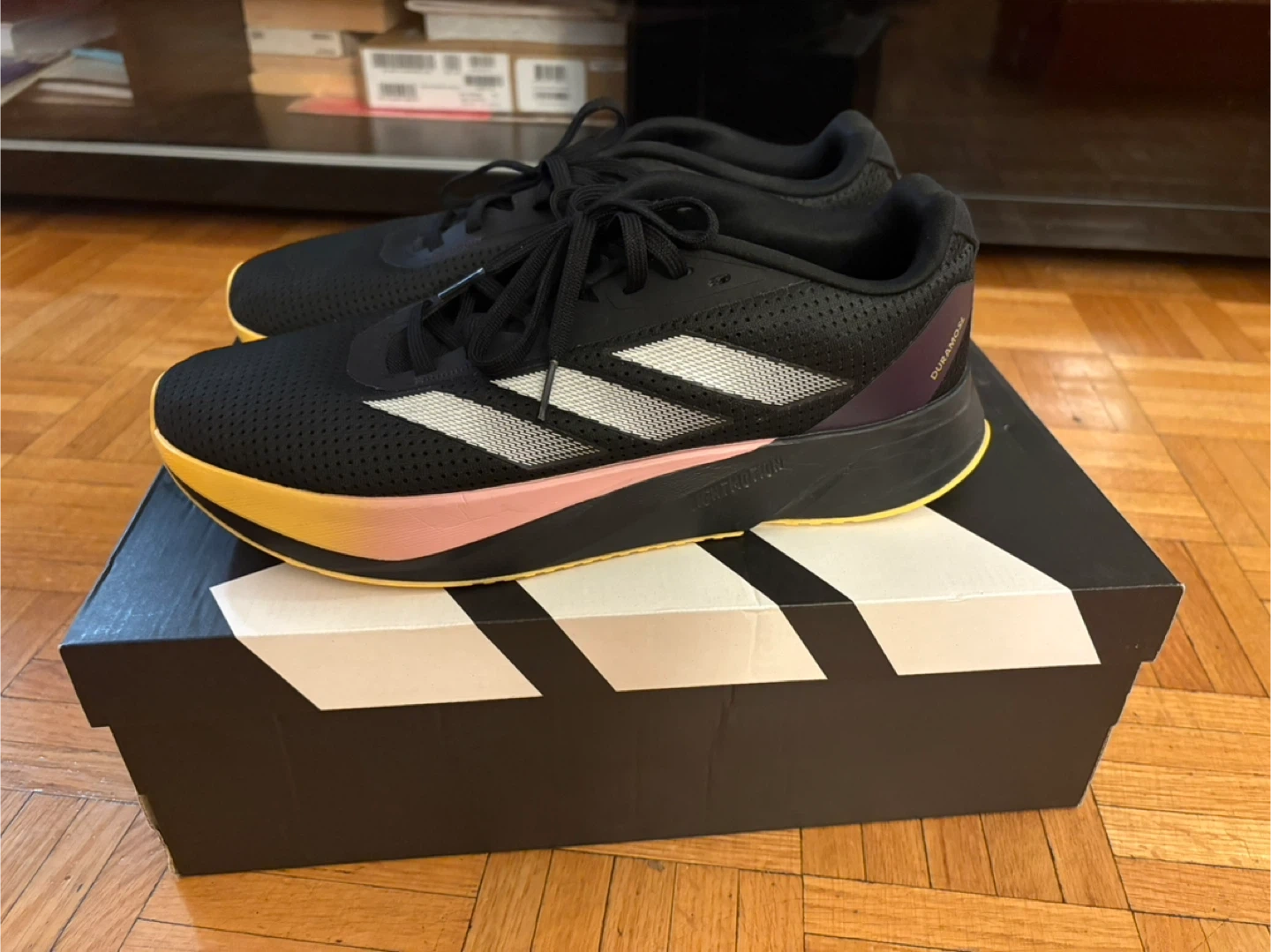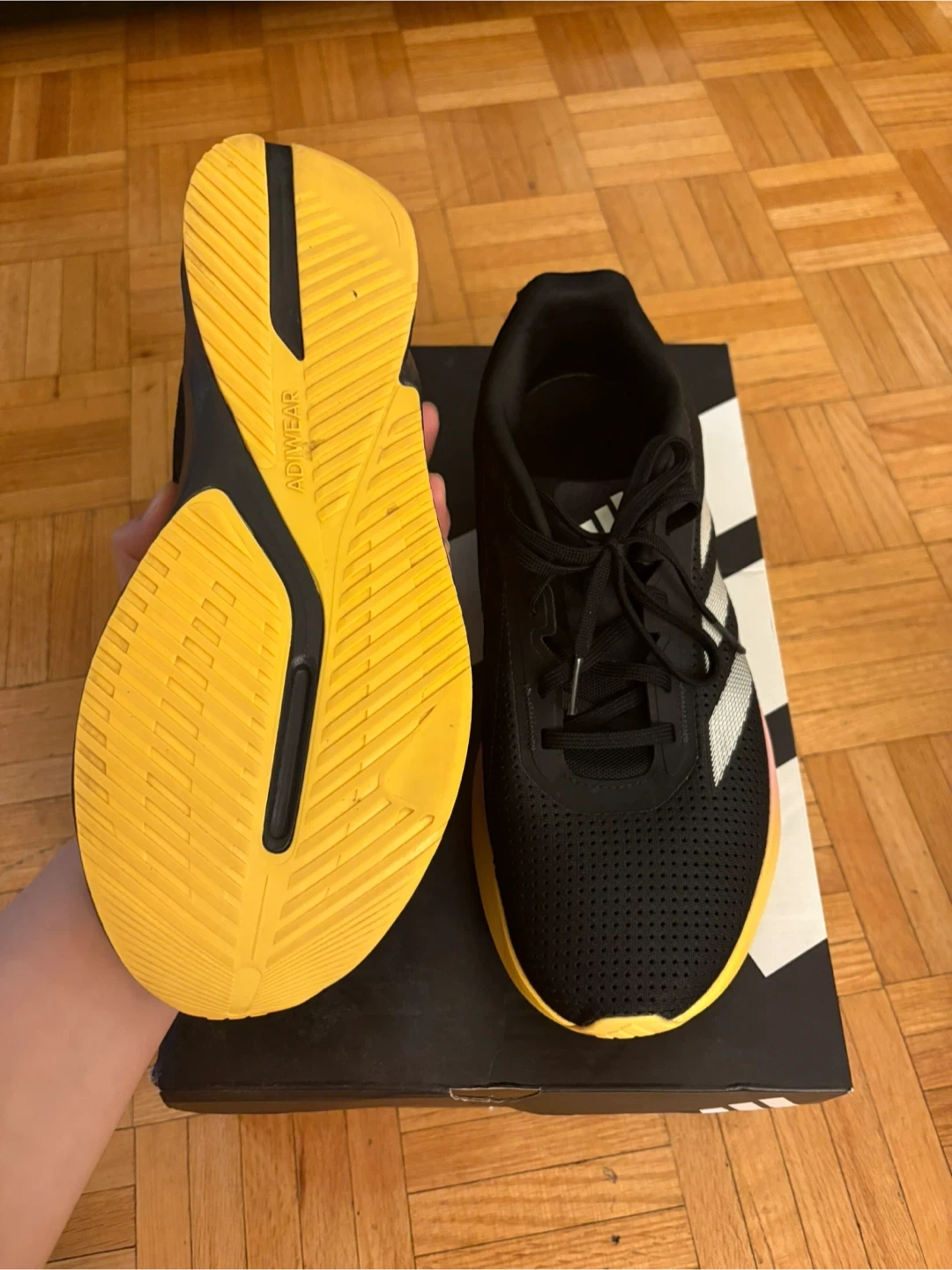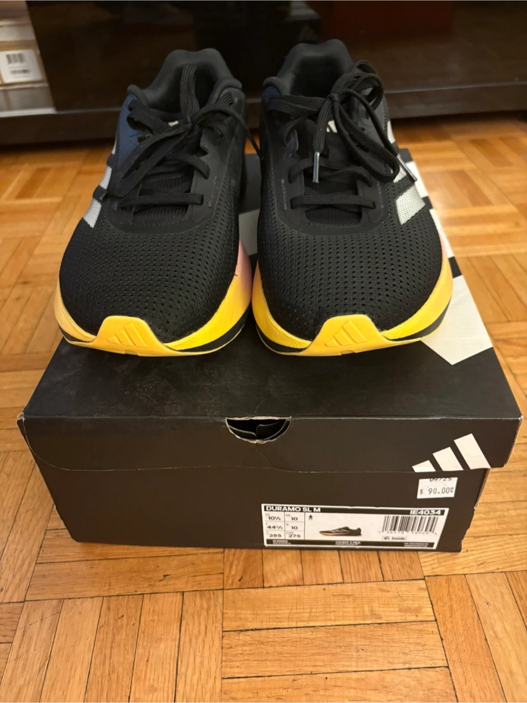 Selling a pair of Adidas Duramo running shoes in black. They are size 10.5 US. Comes with the box!