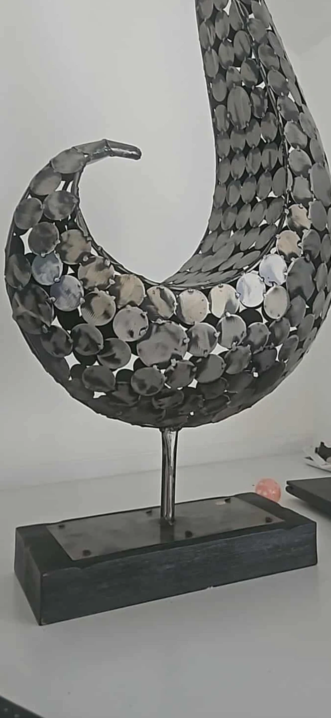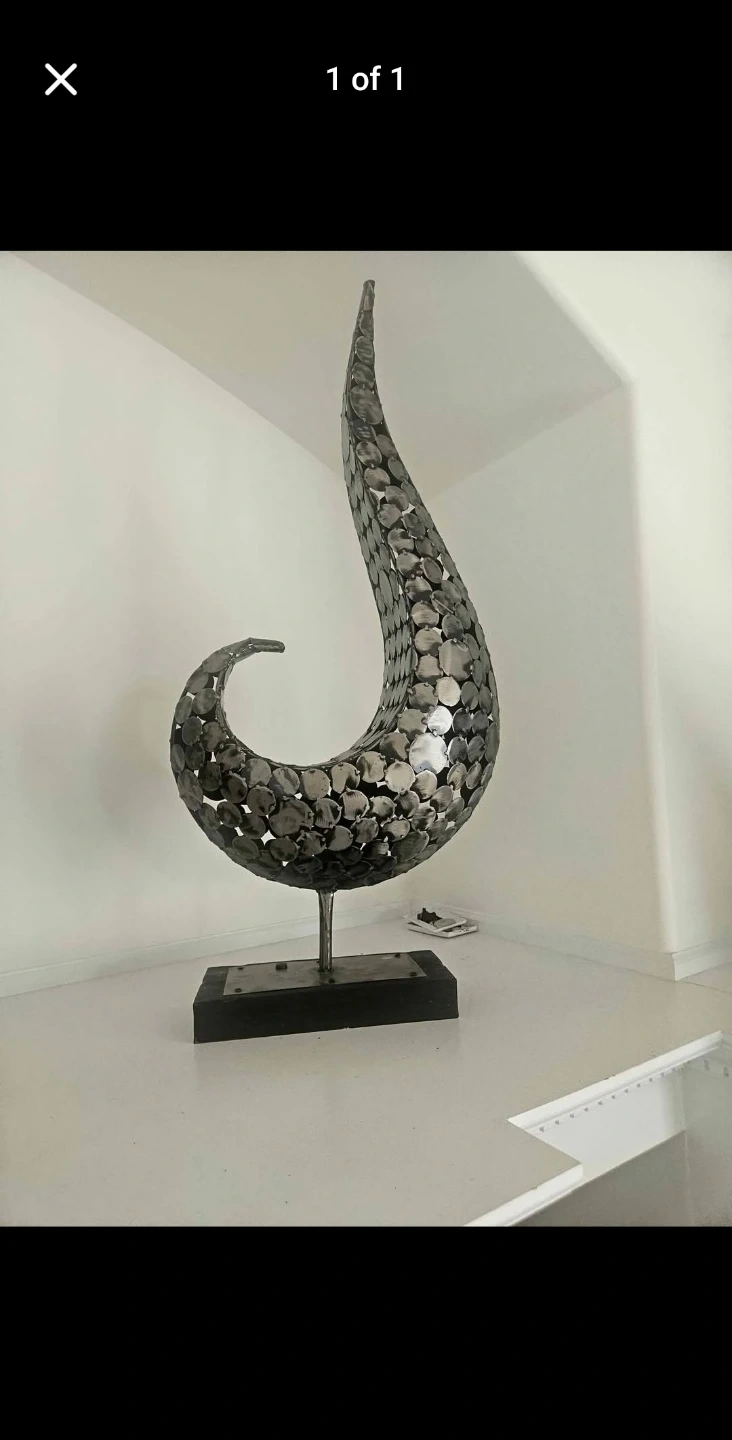 A pair of unique metal decorative sculptures! They are in great condition and would make a striking addition to any room. The design features a teardrop shape with a base and is to mimic the flight of a bird.