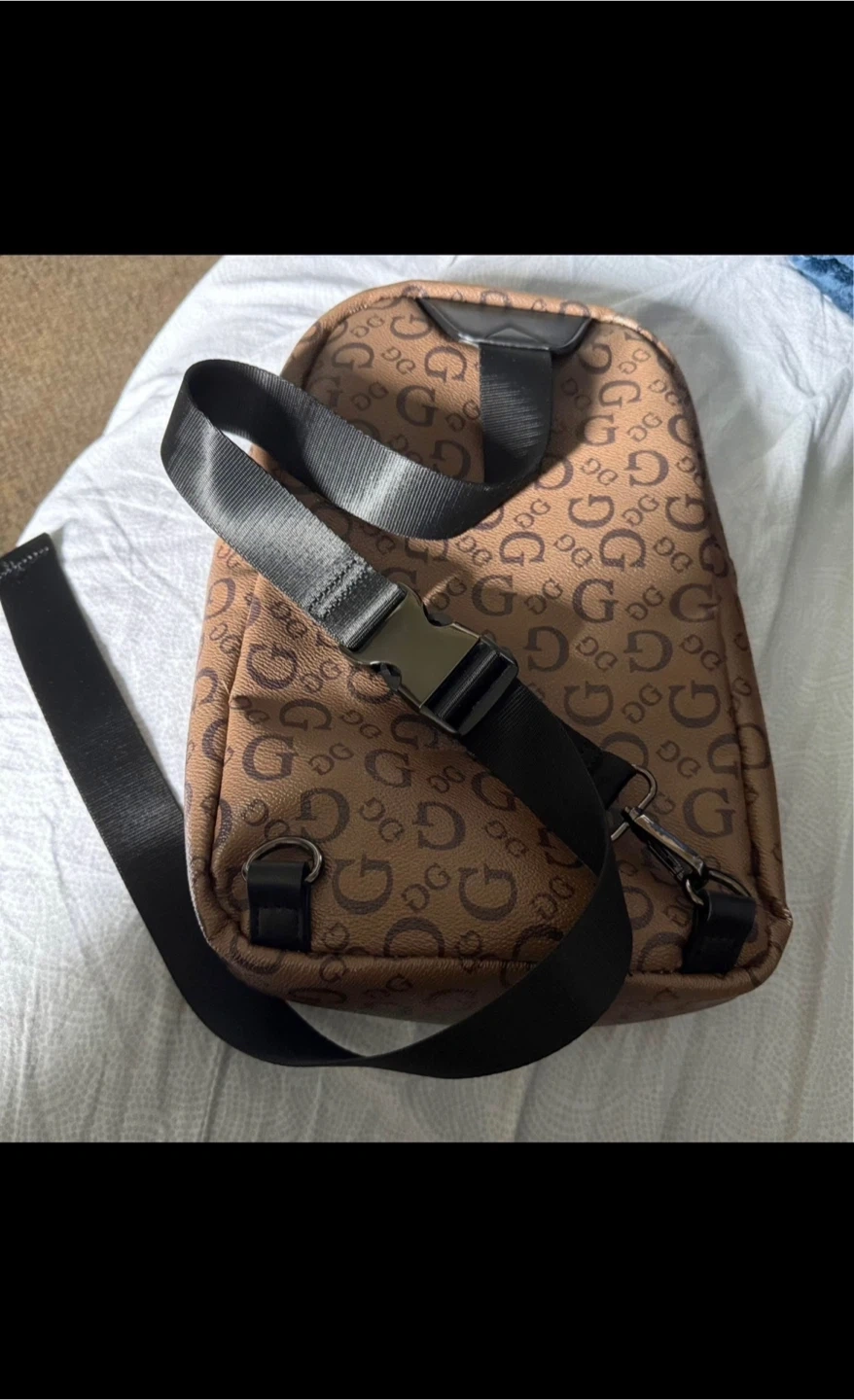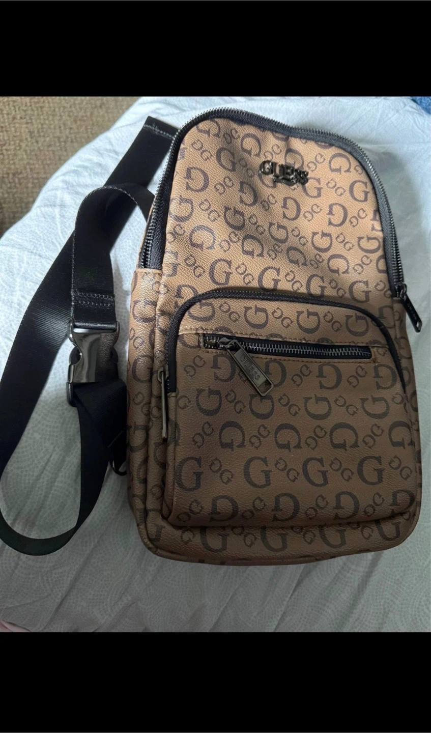 Selling a Guess sling backpack in great condition! It features a repeating 'G' logo pattern and a comfortable, adjustable strap. Perfect for carrying your essentials while keeping your hands free