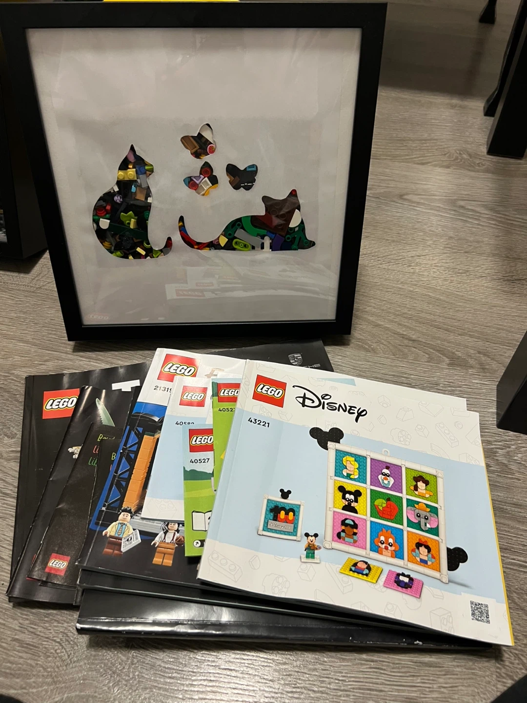 • Custom DIY Art: A handmade shadow box frame featuring a cat silhouette filled with colorful LEGO pieces.