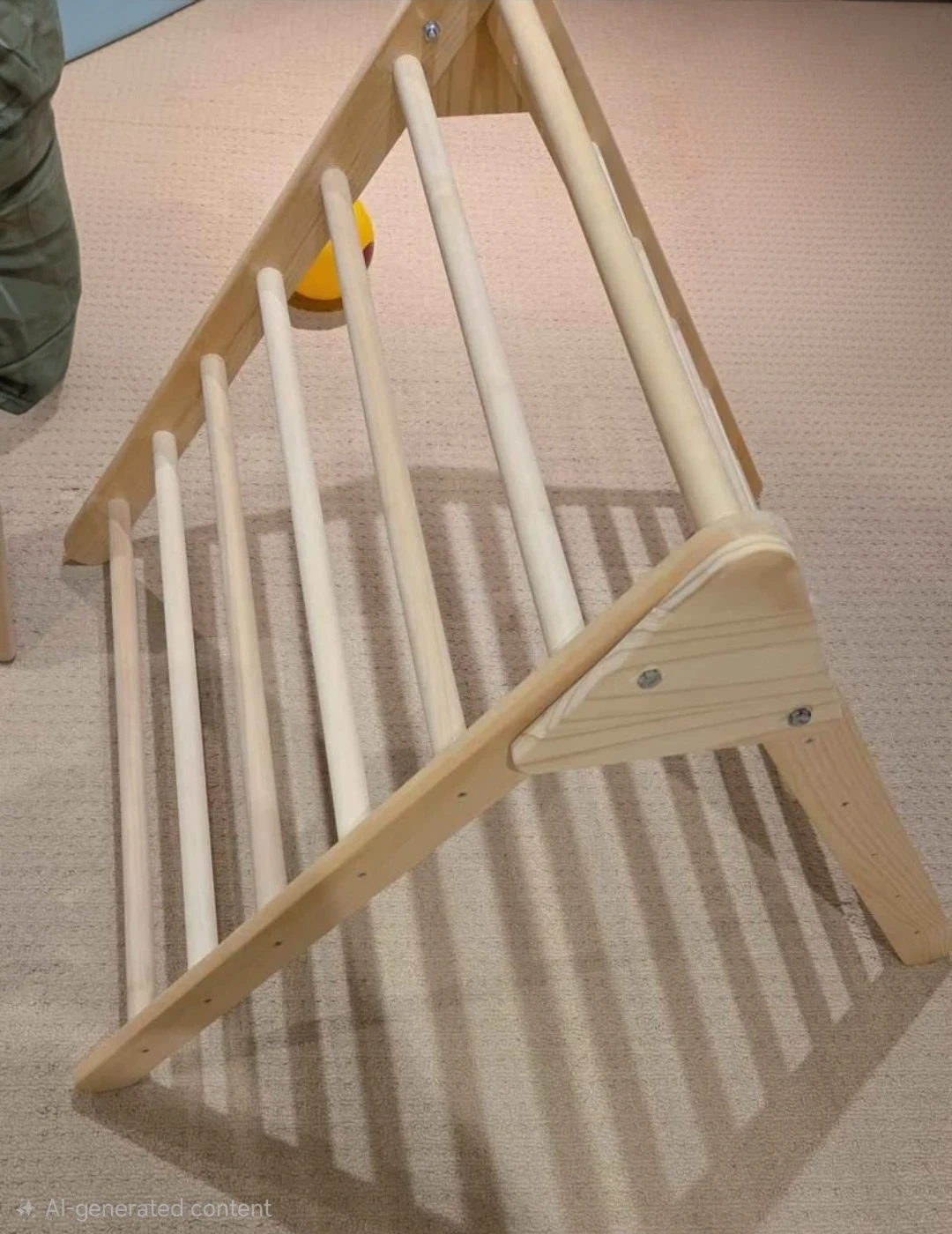 Custom built Pikler Triangle. Frame is made from Pine and Aspen dowels, slide is made from MDF and Pine for climbing rungs. Folds up for storage. Very sturdy and can hold up to 50-60lbs and is about 36" to the top of the triangle.