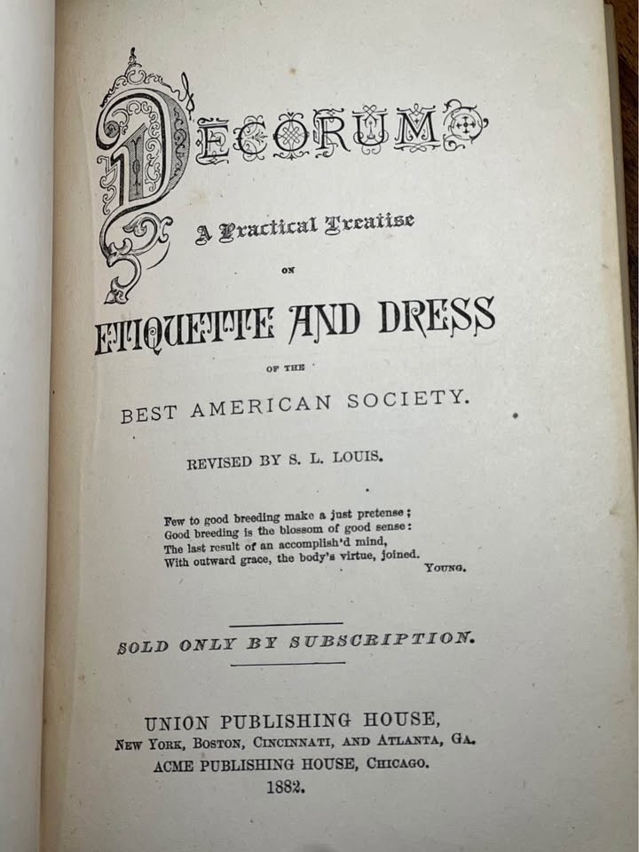 This is a vintage copy of the book Decorum: A Practical Treatise on Etiquette and Dress of the Best American Society.