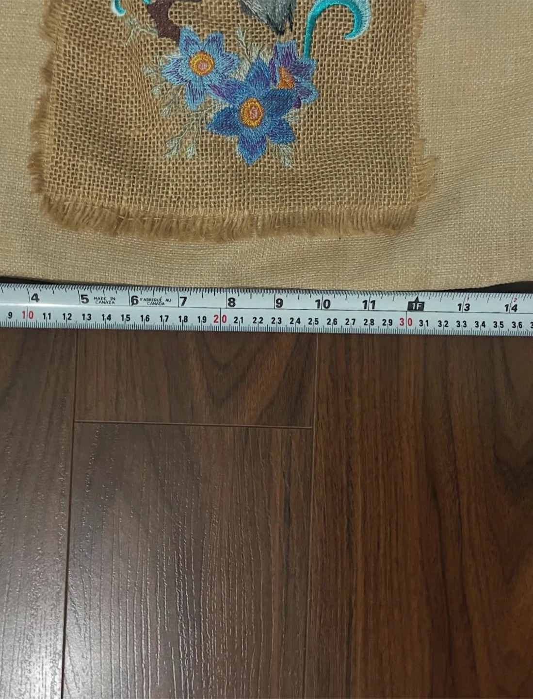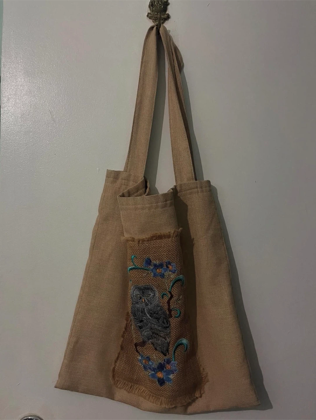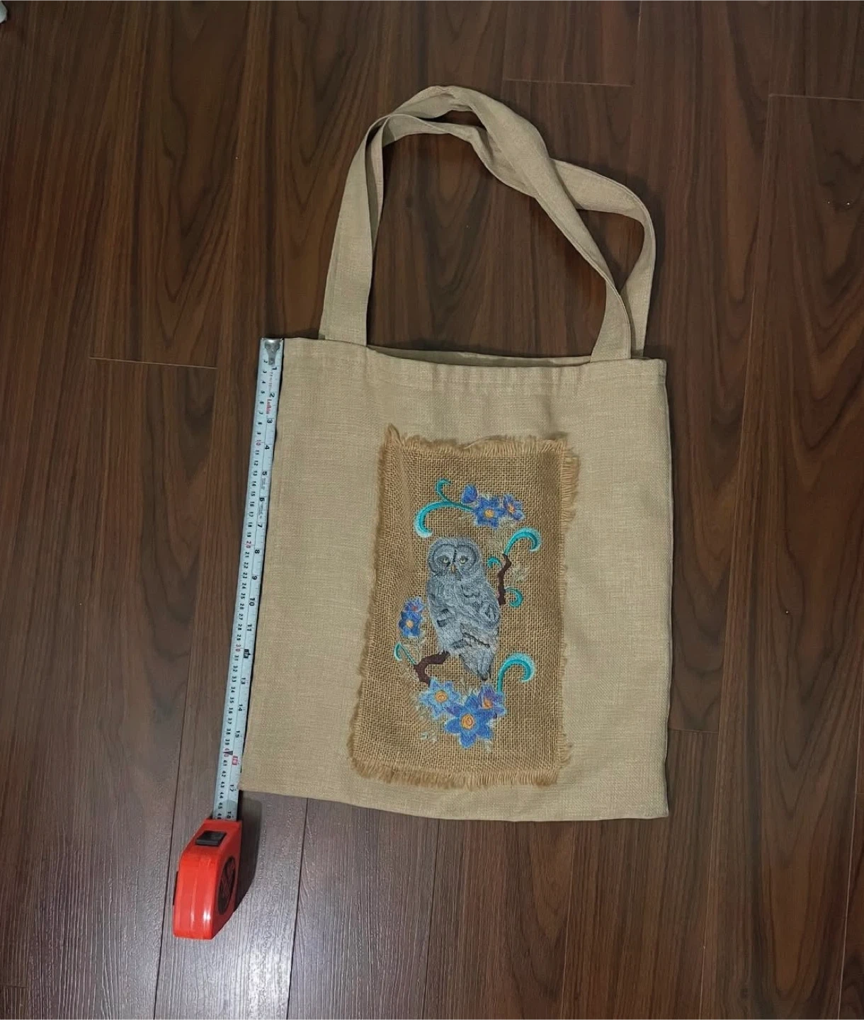 Check out this unique handmade tote bag! It features a lovely embroidered owl design. The bag is made of burlap and has a floral patterned lining. It measures approximately 17 inches in height and 13 inches in width, perfect for carrying your everyday essentials!