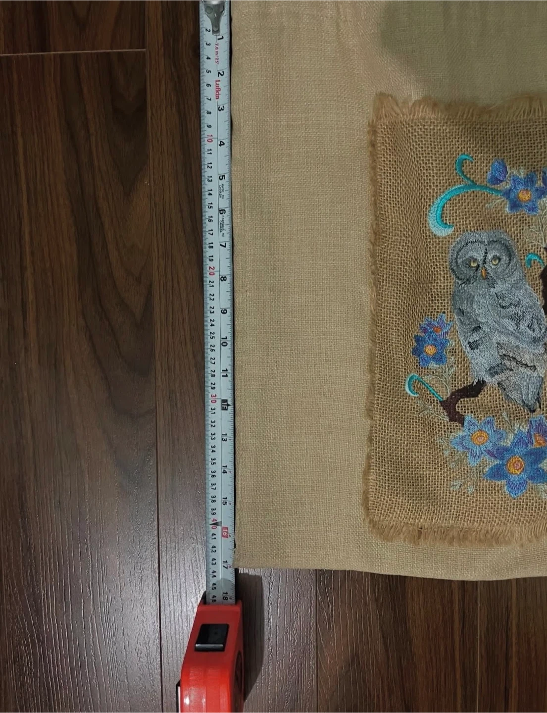 Check out this unique handmade tote bag! It features a lovely embroidered owl design. The bag is made of burlap and has a floral patterned lining. It measures approximately 17 inches in height and 13 inches in width, perfect for carrying your everyday essentials!
