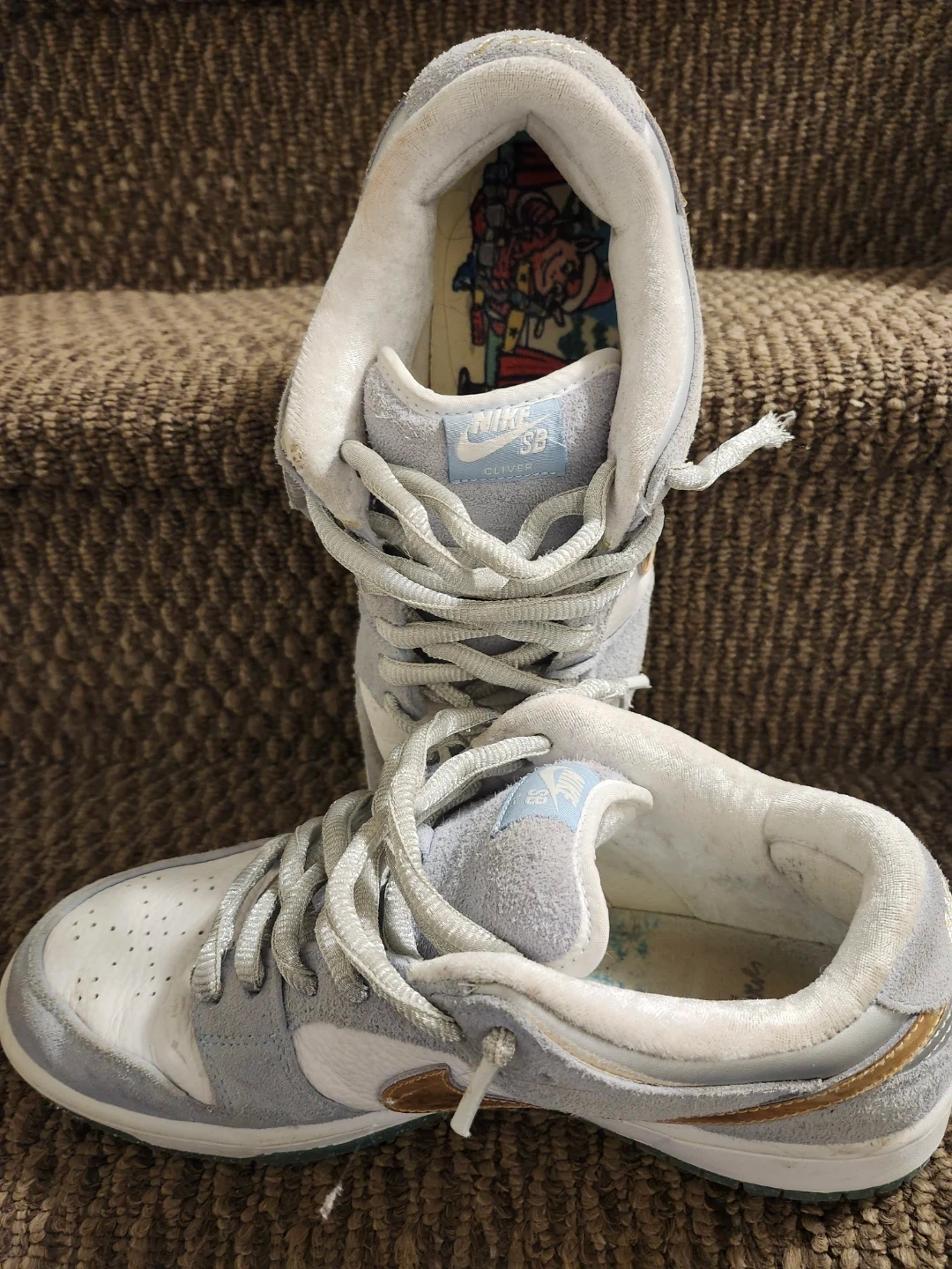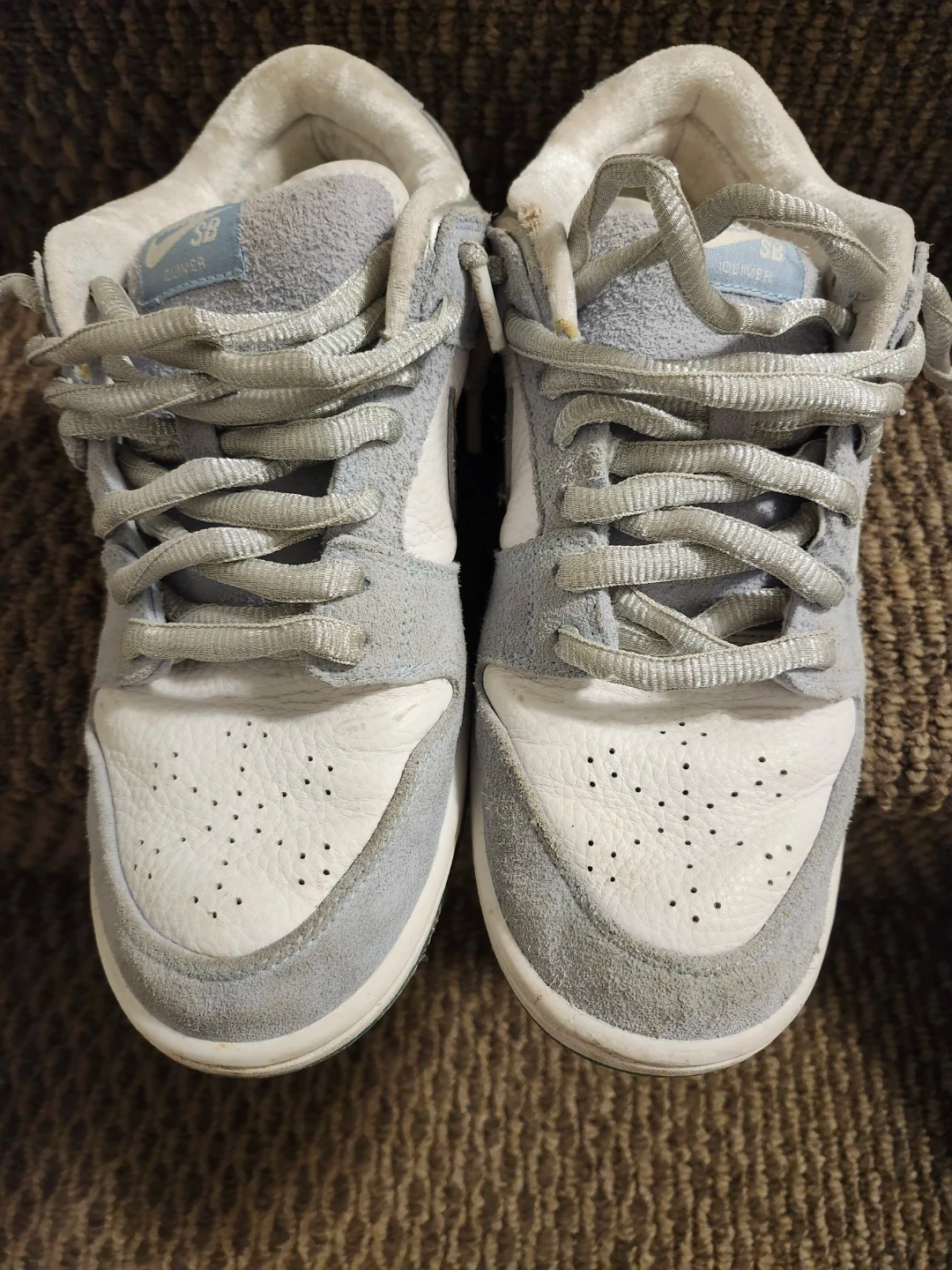 Selling a pair of Nike SB Dunk Low Pro shoes in ice white and grey. They show some signs of wear, but still have lots of life left! Great for skating or casual wear