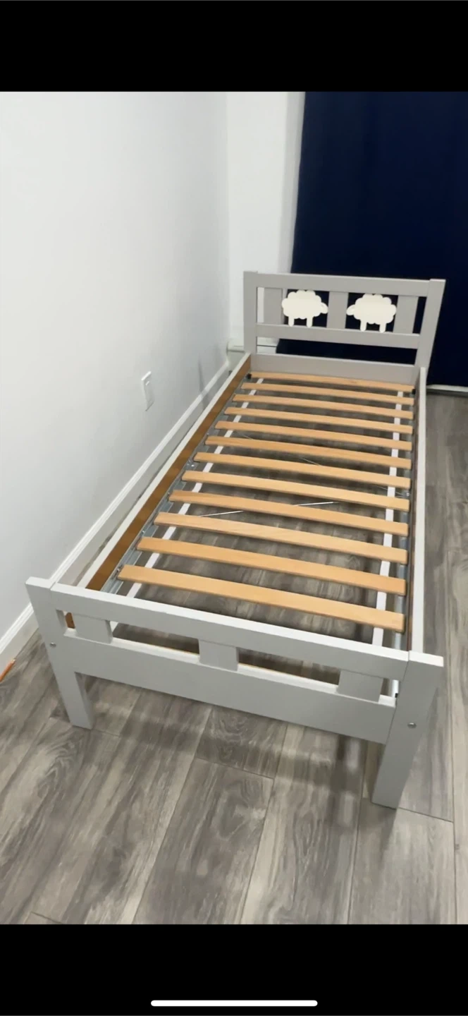Selling a cute gray kids bed frame! It has a sweet cloud design on the headboard. Perfect for a toddler's room or a small child's bedroom. The bed frame is in good condition and ready for a new home