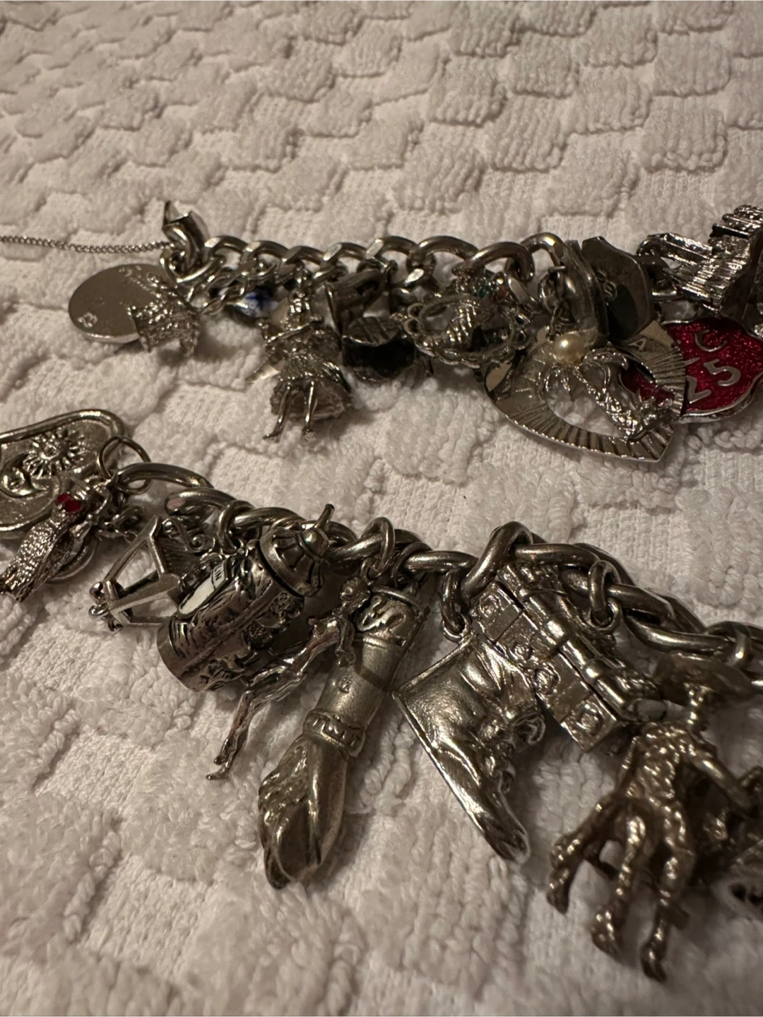 Vintage charm bracelets loaded with charms. A few charms are silver (I think), but because I can’t be sure, I’m listing it as if they aren’t. I’m decluttering and just want them out of the jewelry box.