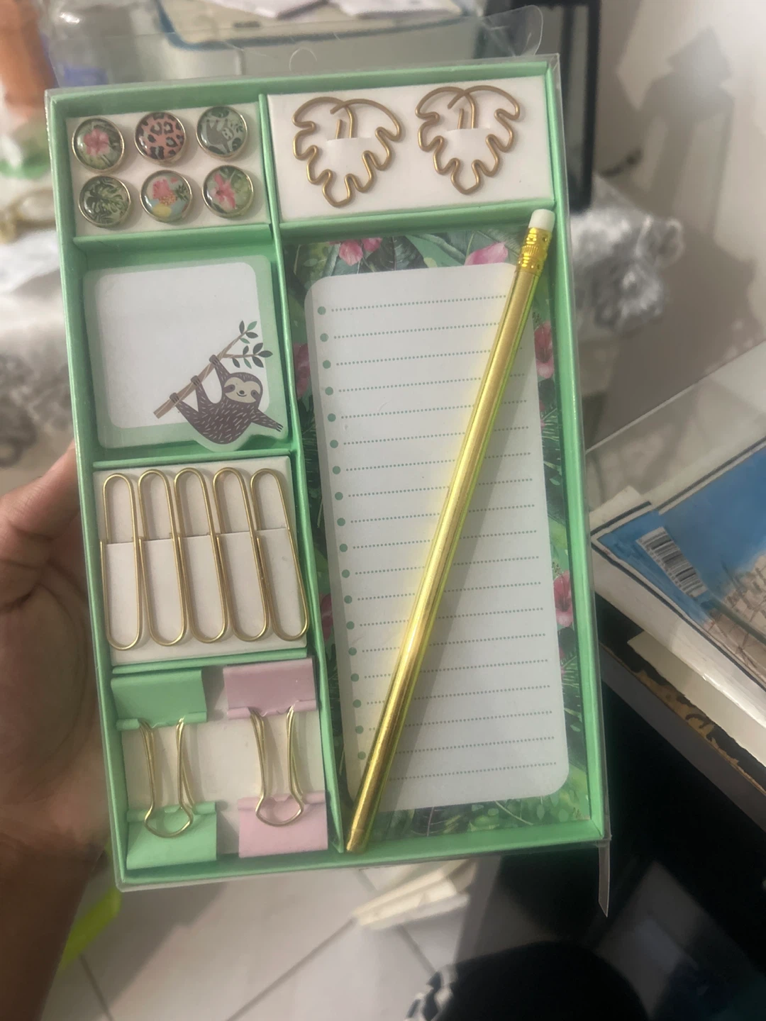 This tropical-themed stationery set is brand new and ready to brighten up your desk! It includes a variety of cute and functional items such as decorative push pins, leaf-shaped paper clips, a notepad with a sloth design, and a golden pencil. Perfect for adding a touch of fun to your office or study space!