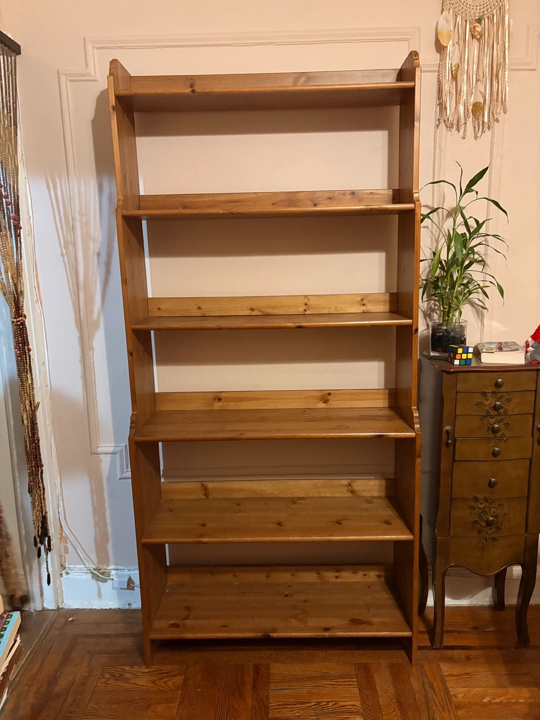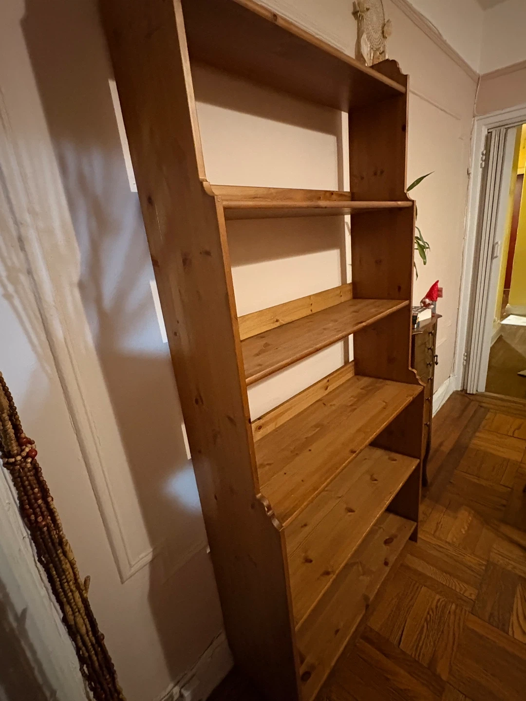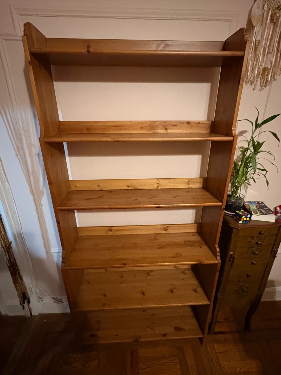 Selling a wooden bookcase shelf. It's a great piece for displaying books or other items. It has a natural wood color and a classic design that would fit well in any room.