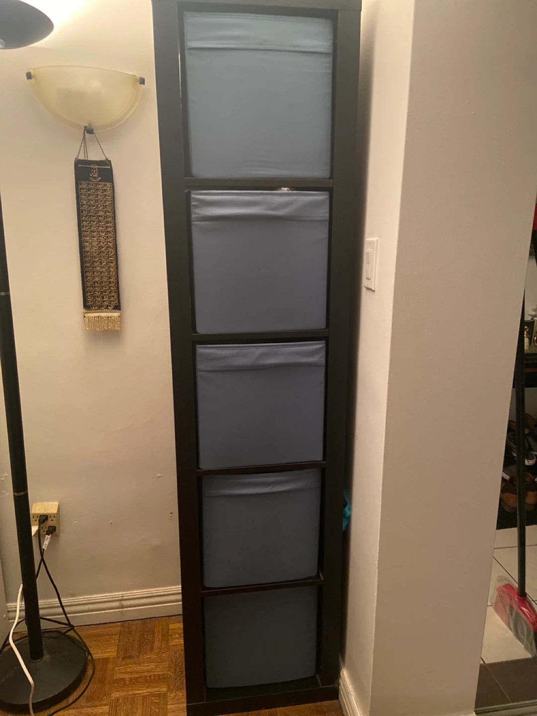 Selling an IKEA Kallax shelf unit with 5 blue fabric inserts. It's in great condition and perfect for organizing any space! The unit is a dark brown colour and the inserts are a nice light blue. I have 2 sets of shelf units