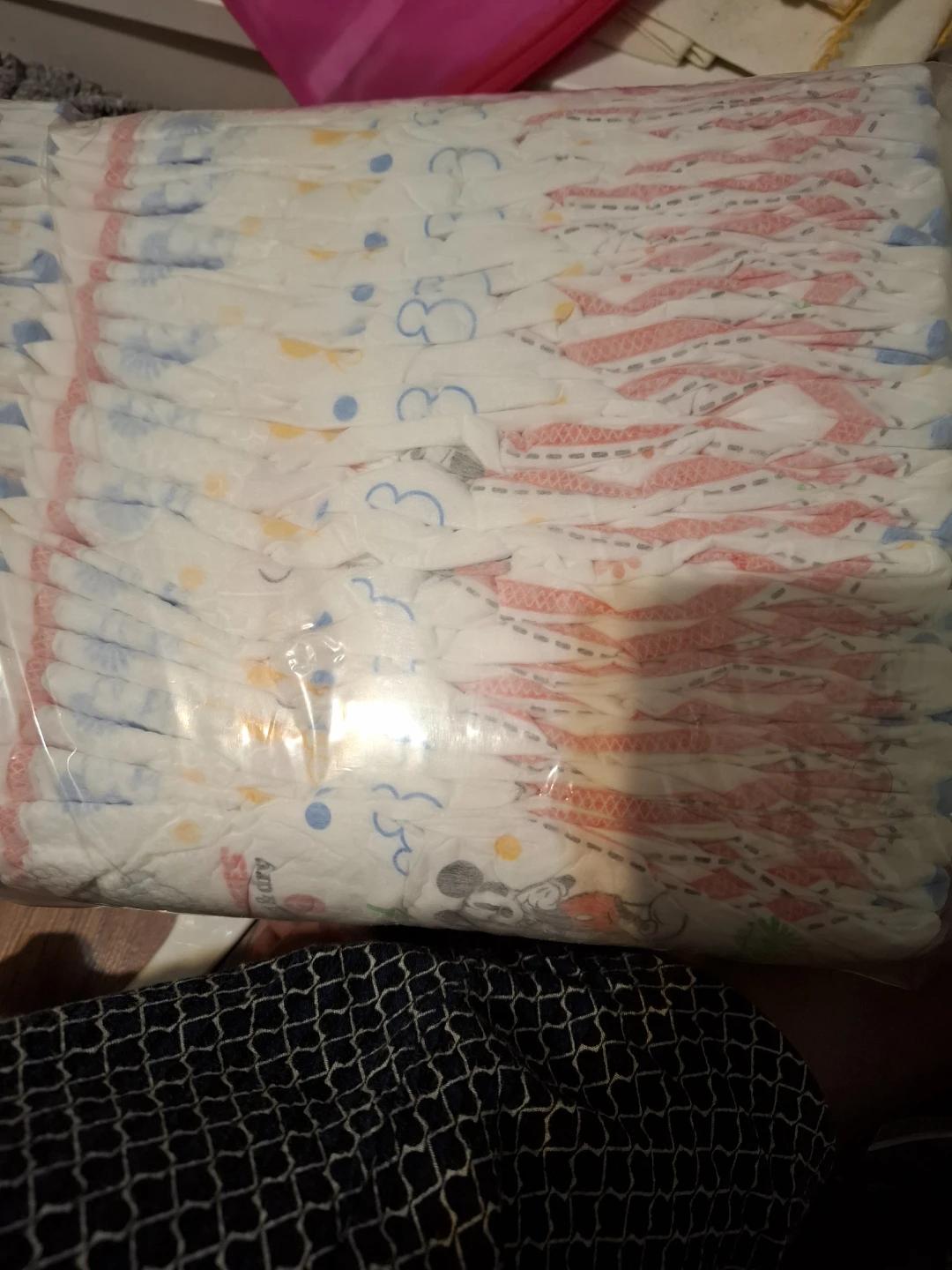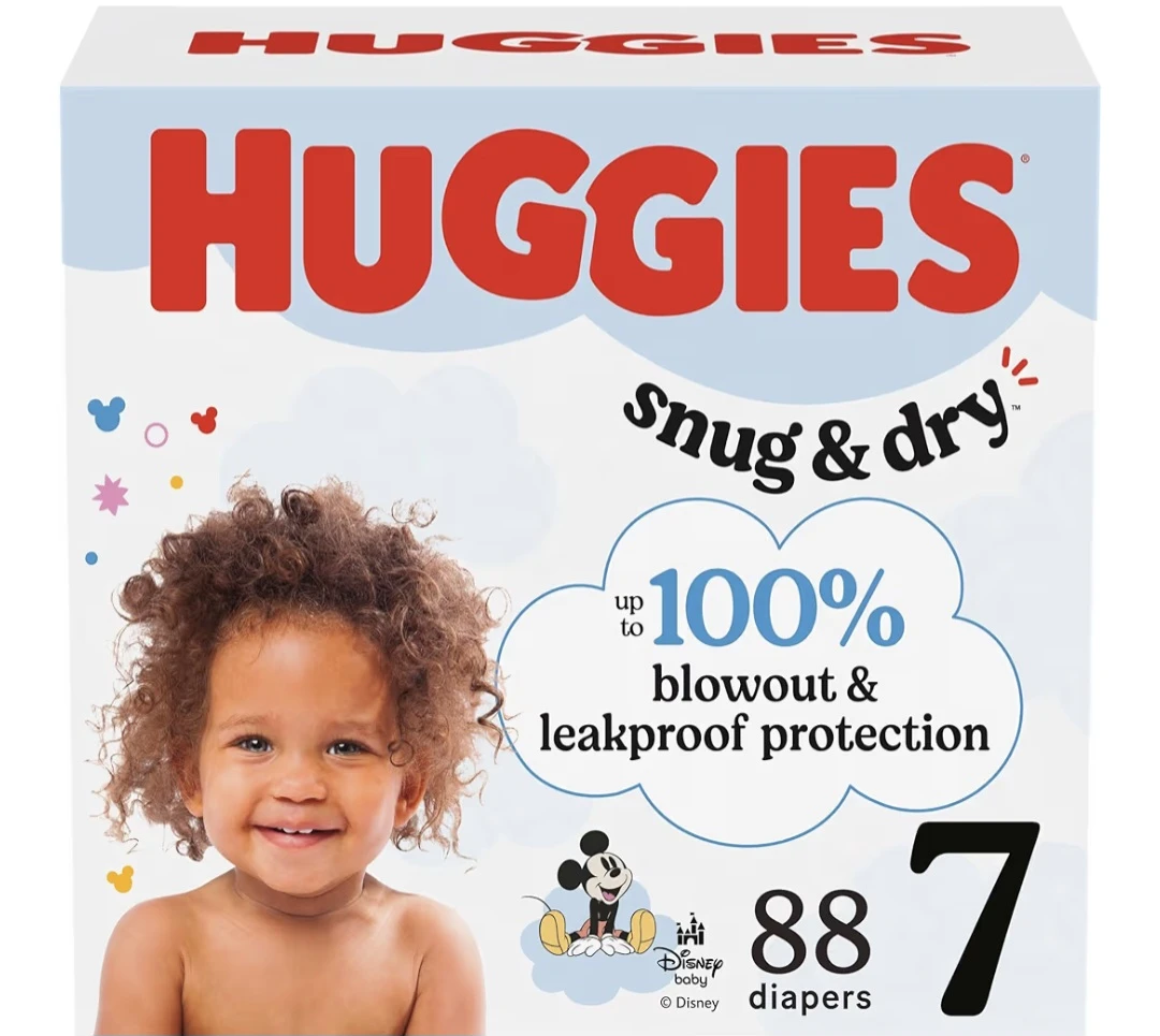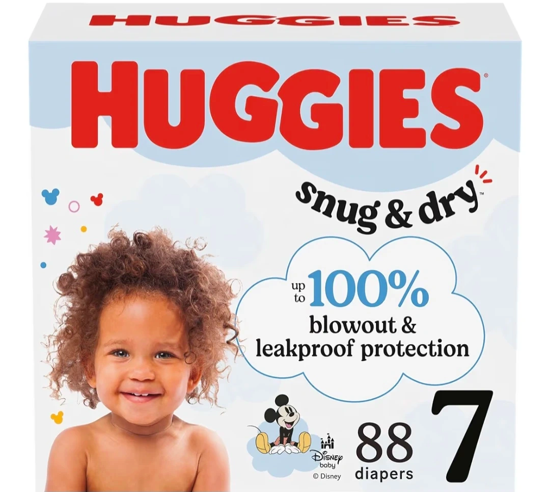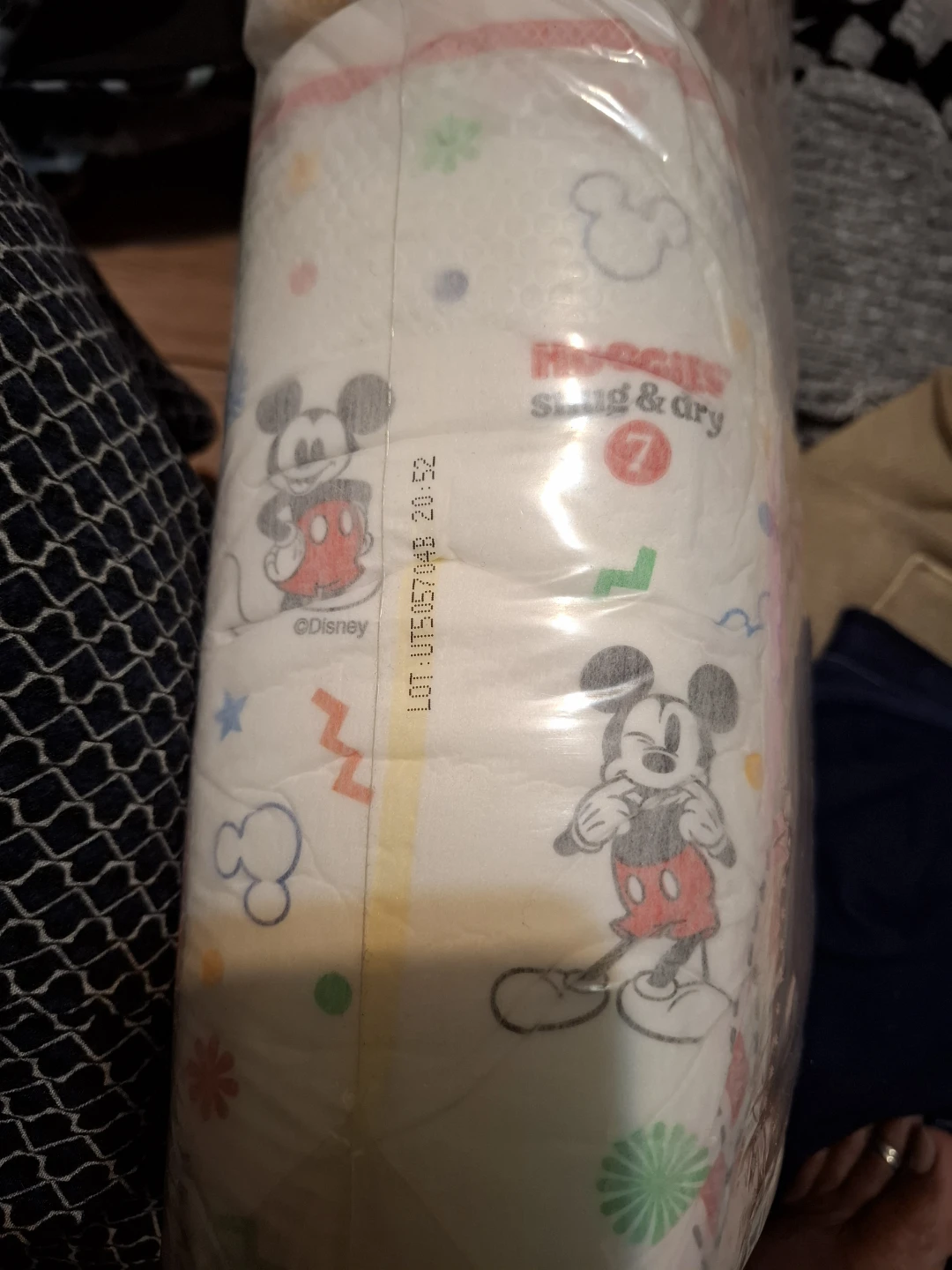Selling a pack of Huggies Snug & Dry diapers in size 7. These diapers feature a cute Mickey Mouse design and offer up to 100% blowout and leakproof protection.