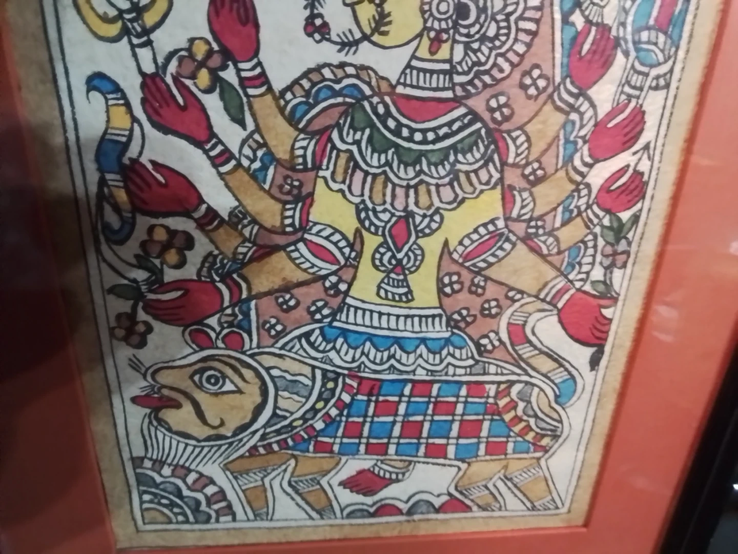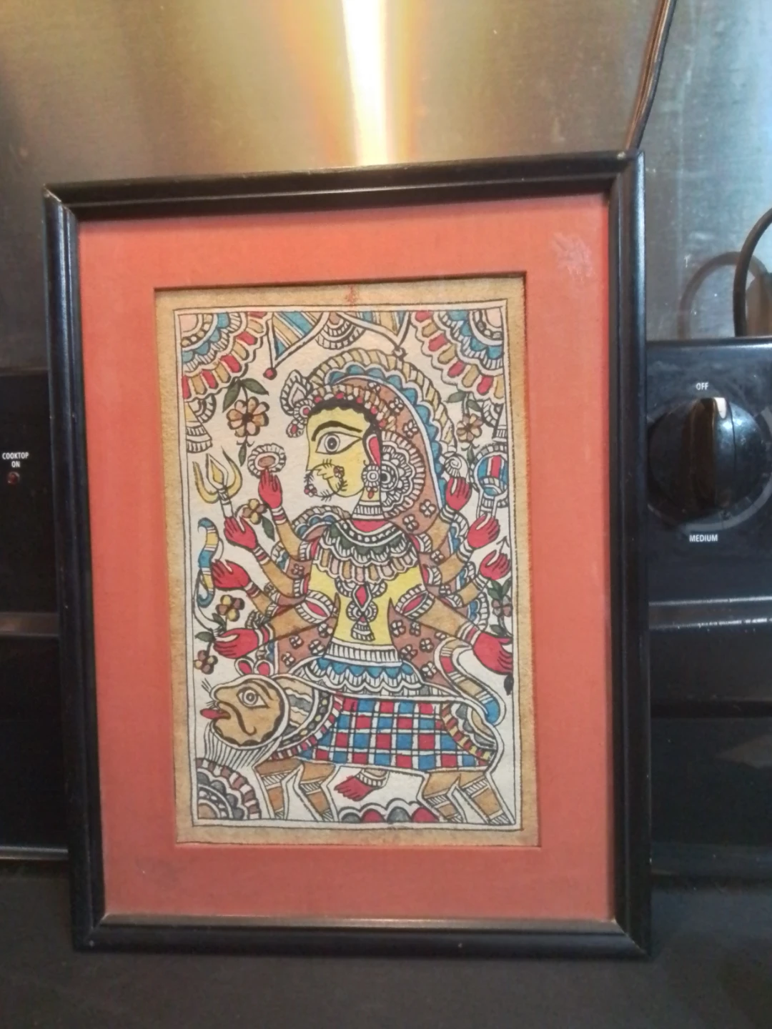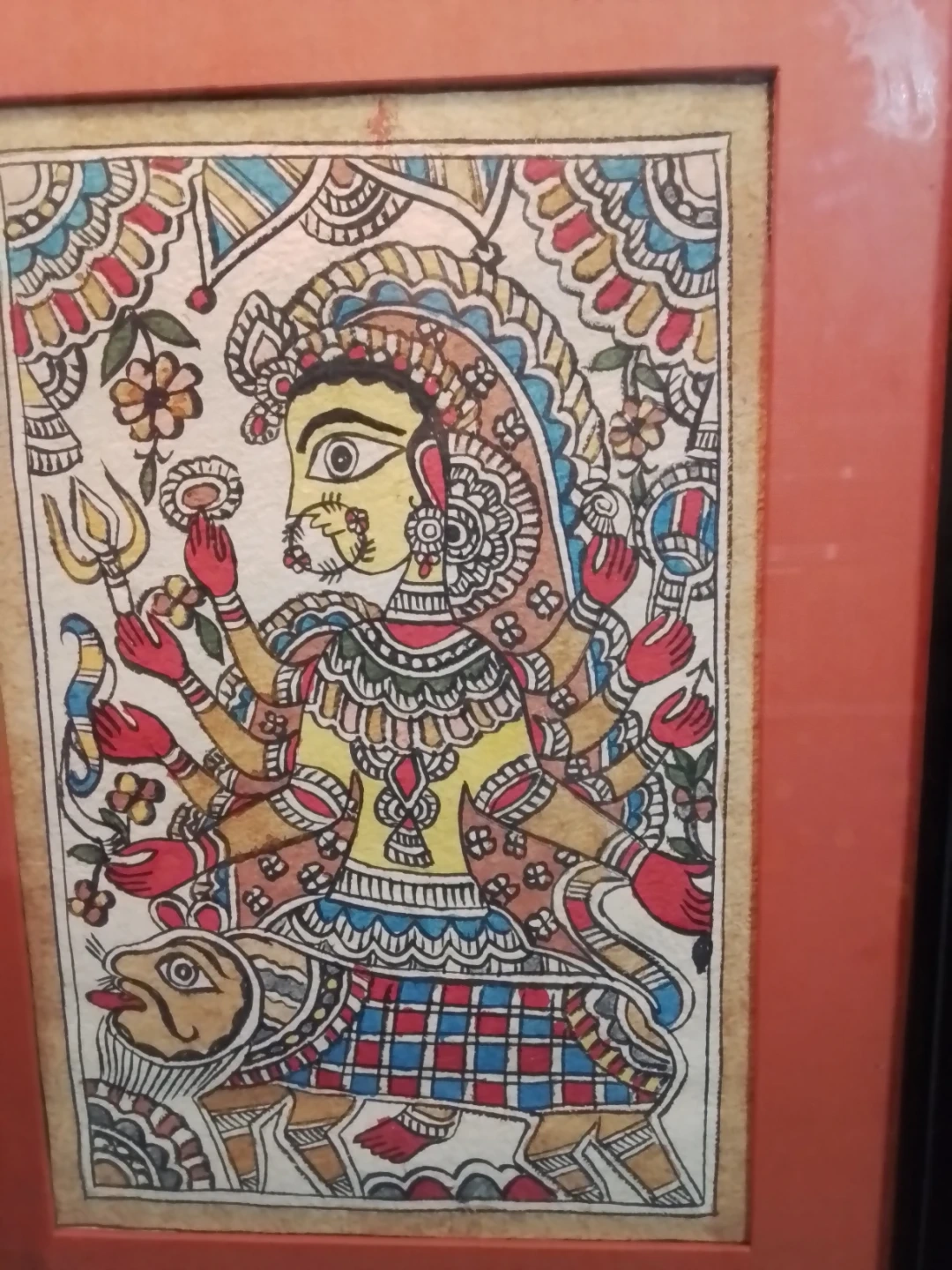 This is a framed Madhubani painting. It features a traditional design with vibrant colours and intricate details. It would add a lovely touch of culture to any room!