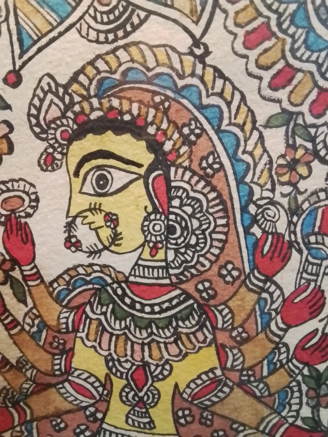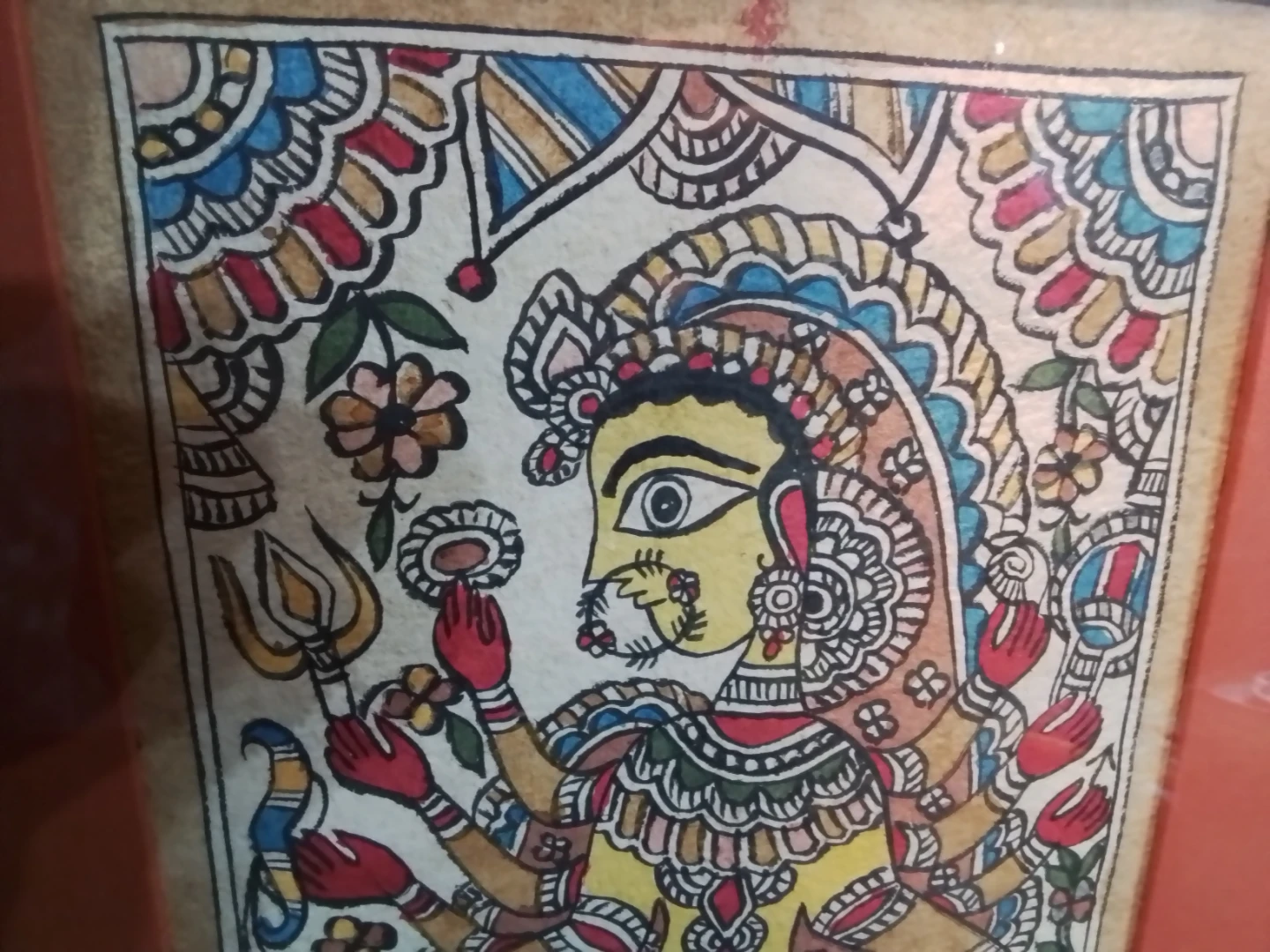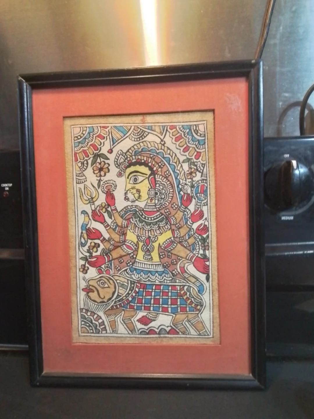 This is a framed Madhubani painting. It features a traditional design with vibrant colours and intricate details. It would add a lovely touch of culture to any room!
