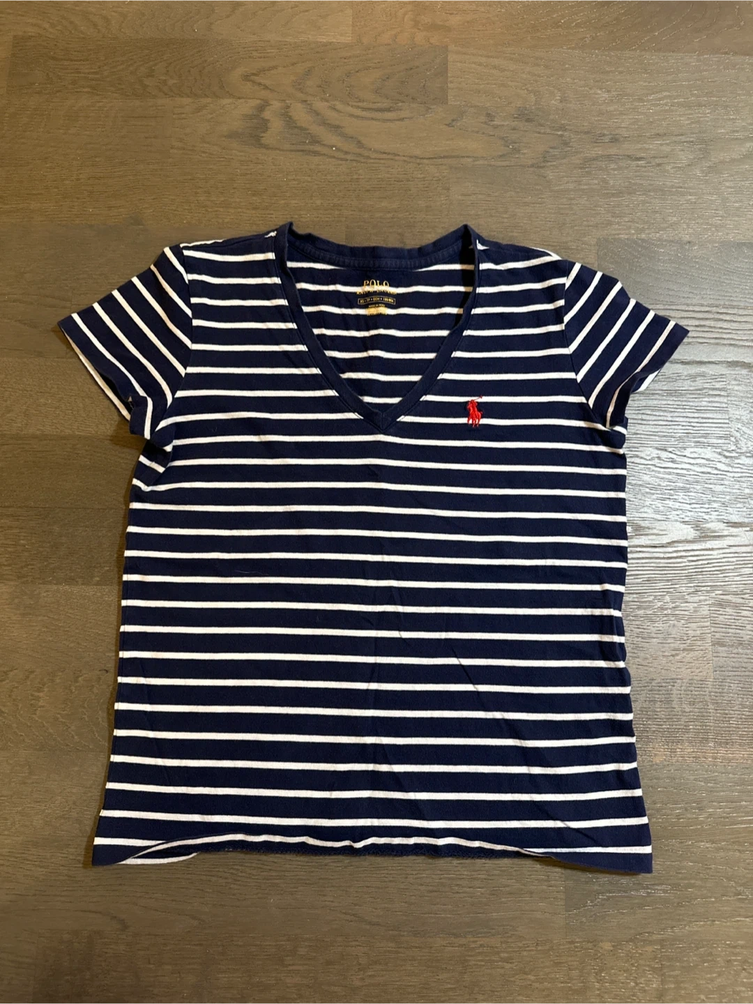Selling a cute Polo Ralph Lauren striped V-neck T-shirt! It's a size XS and features a navy blue and white striped pattern with the classic red Polo logo. Perfect for a casual, preppy look 👔