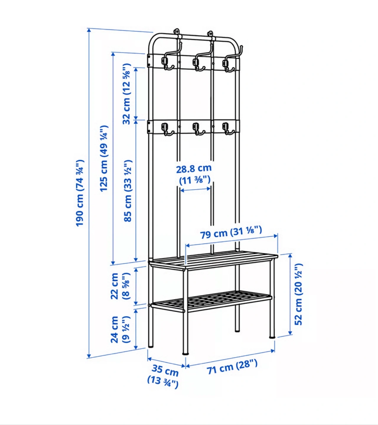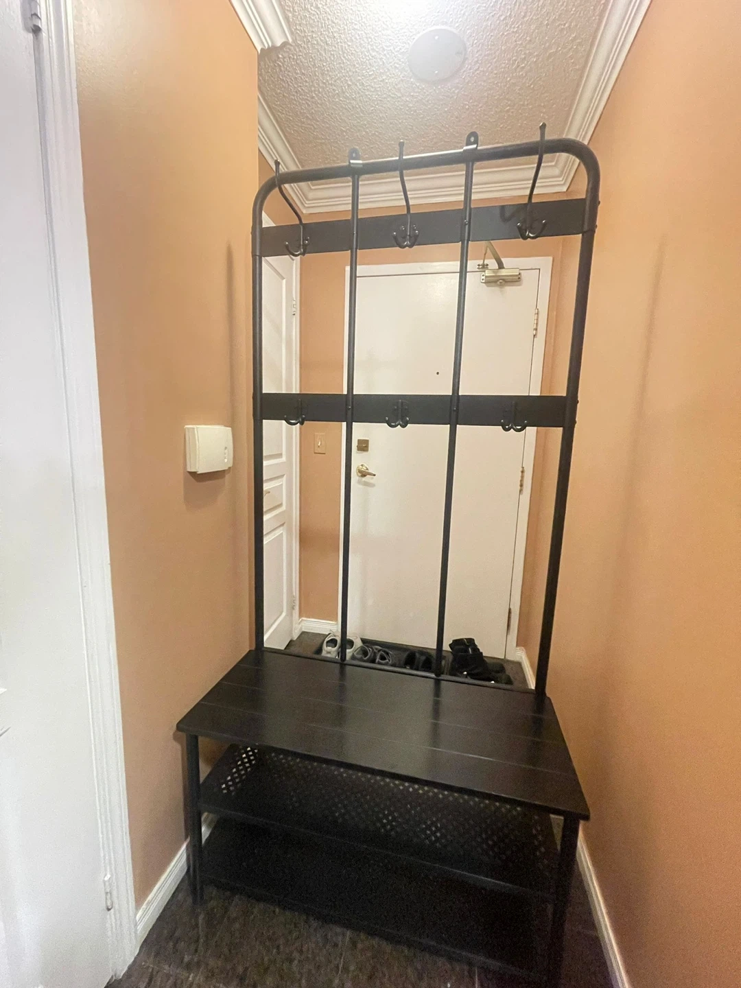I'm selling an IKEA NIPÅSEN Coat rack and bench w shoe storage, black. It's a great way to keep your entryway organized! The dimensions are 190x35x79 cm (74 3/4x13 3/4x31 1/8 ").