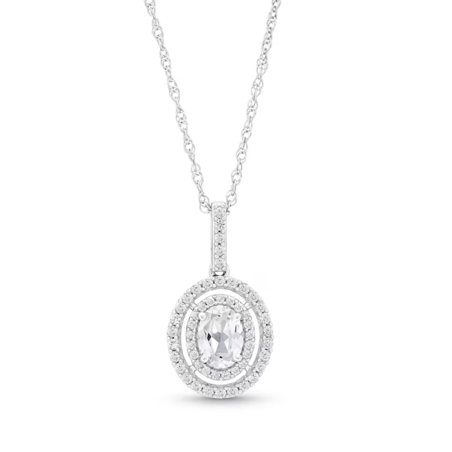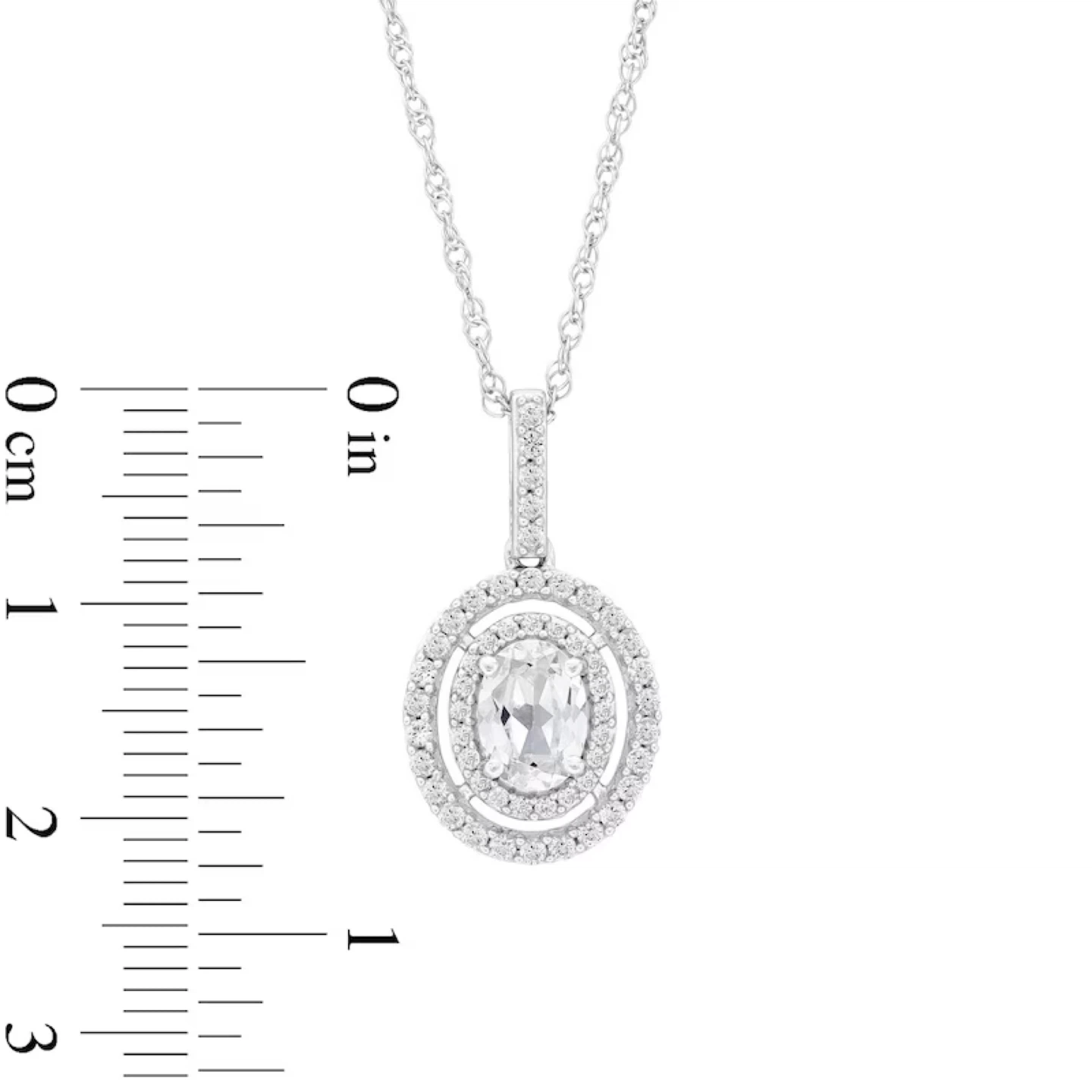 Selling a beautiful peoples white sapphire necklace in sterling silver. This necklace features an oval-shaped white sapphire stone surrounded by smaller stones, creating a dazzling effect. It's a lovely piece to add a touch of elegance to any outfit!