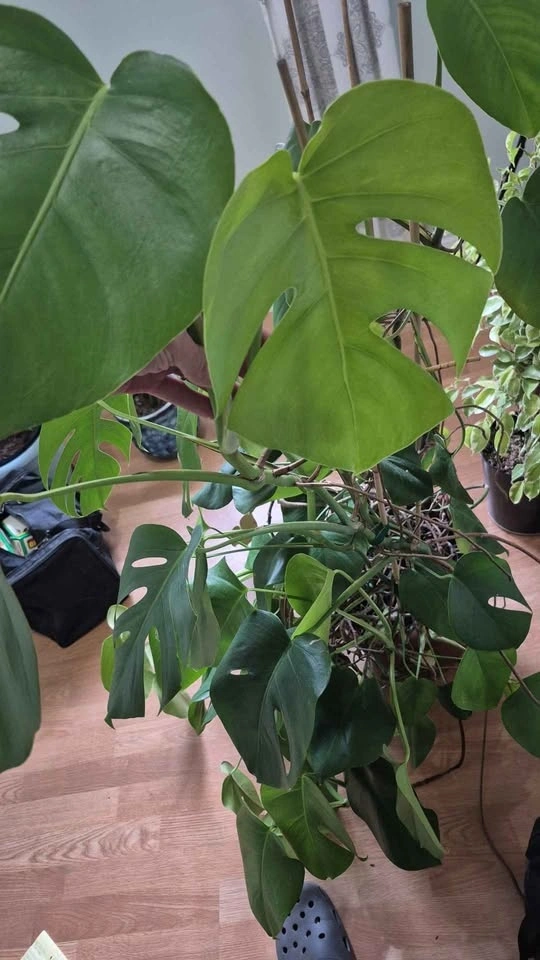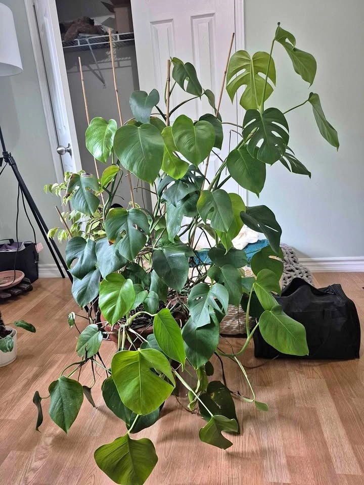 Standing 52 inches tall, this dense juvenile Monstera has began its fenestration and is climbing the bamboo steaks. Was outdoors for the summer but unfortunately have no room for it in the plant room.
