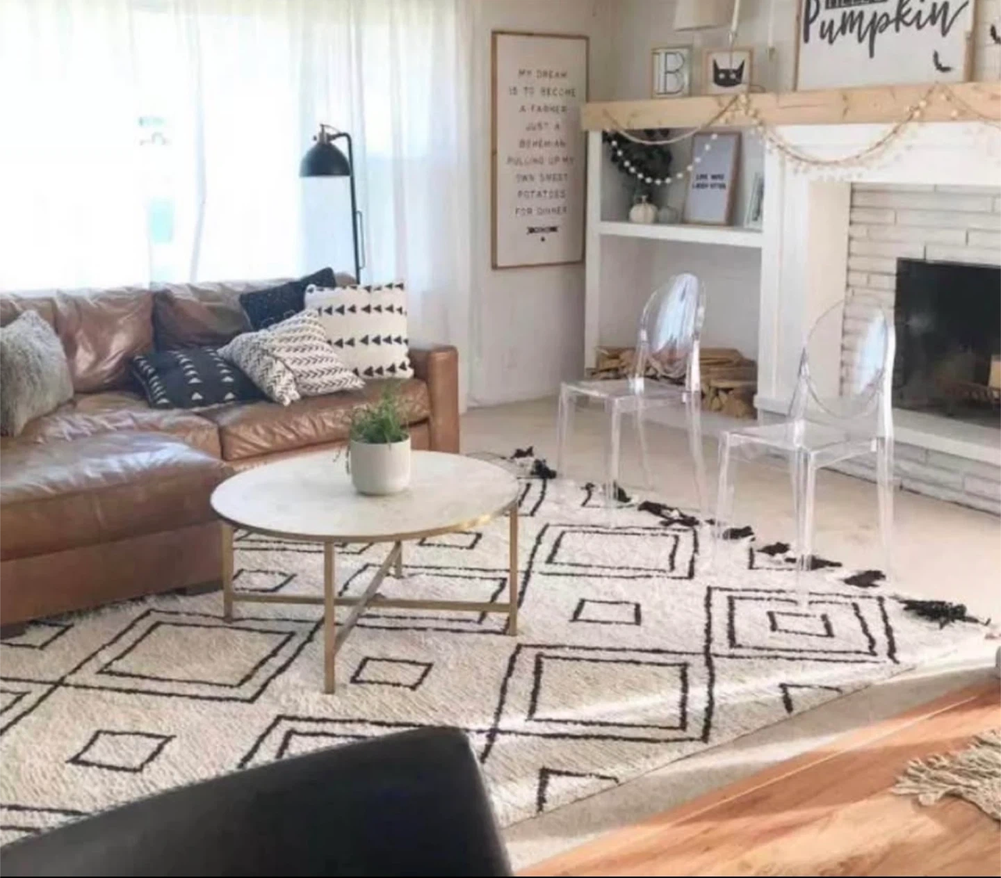 Selling a stylish area rug with a black and white geometric pattern. It's in great condition and would look fantastic in any living room or bedroom!