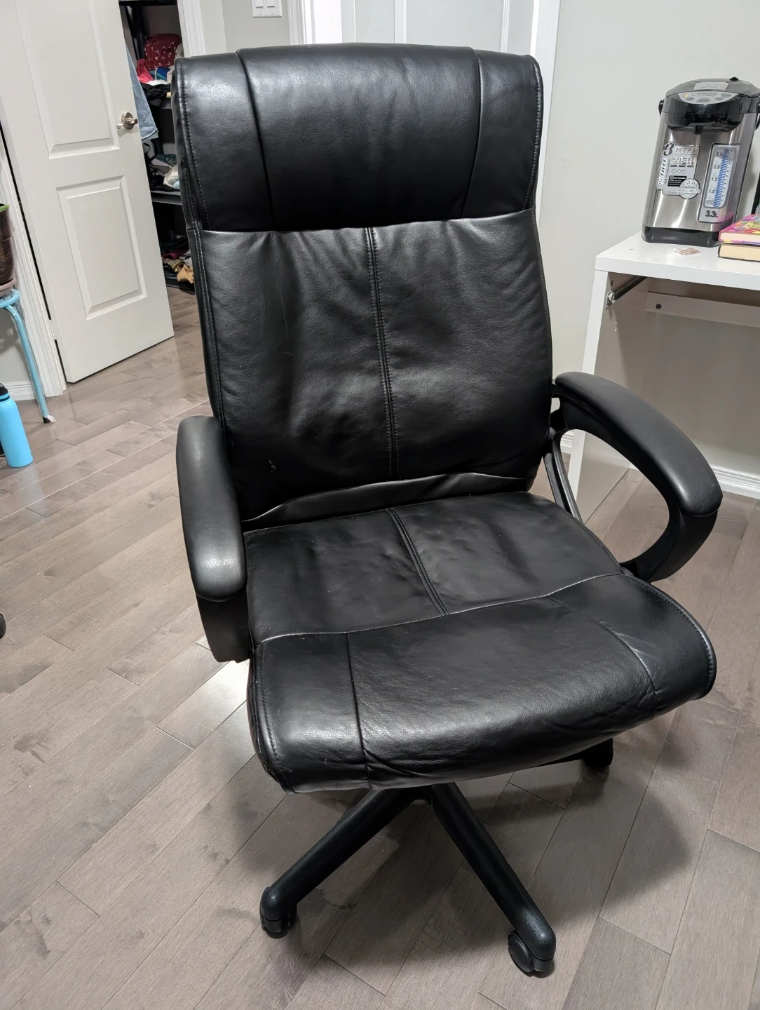 Selling a comfortable black leather office chair. It's in good condition and perfect for your home office setup. The chair has a classic design and is ready to provide support during long work hours. It's a great addition to any workspace!