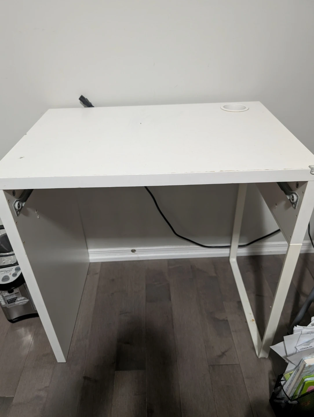 Selling a simple white desk! It's in good condition and perfect for a small workspace or student. It has a hole for cable management.