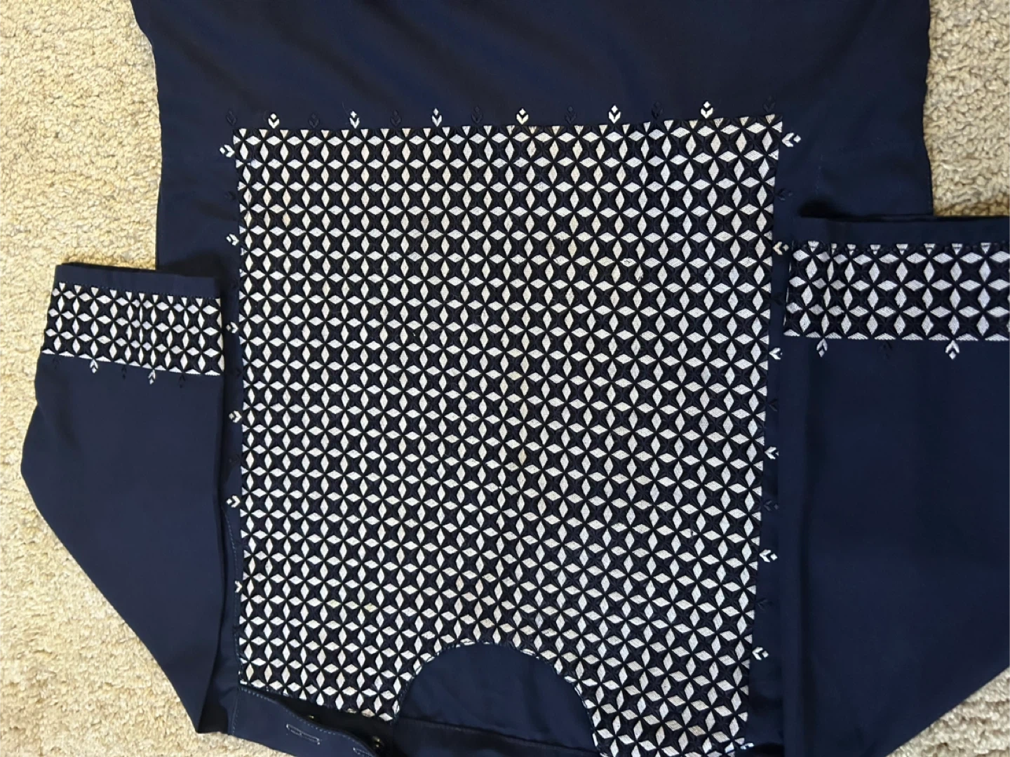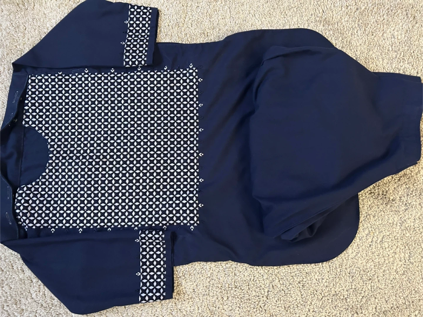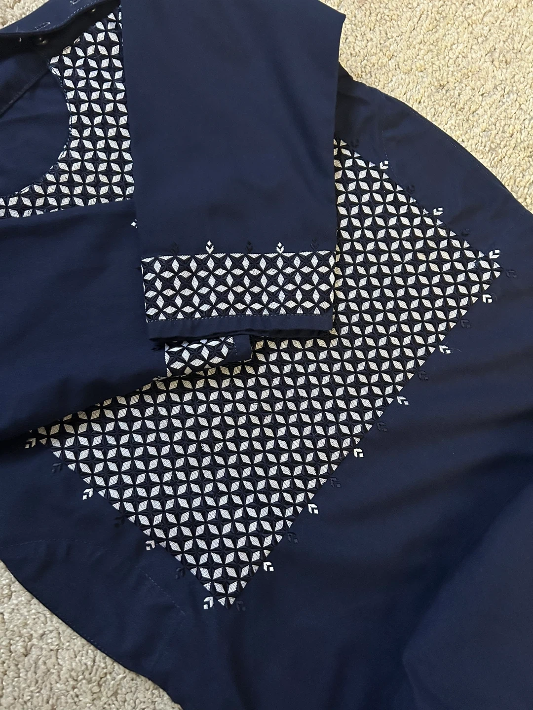 I'm selling a navy blue thobe with white embroidery. It's in great condition and has a unique geometric pattern. Perfect for a special occasion or everyday wear!